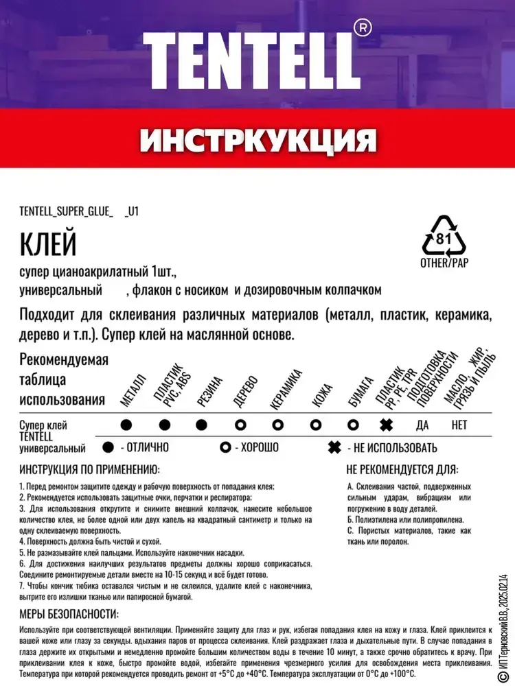 10 гр. Супер клей "TENTELL" универсальный / Клей цианоакрилатный