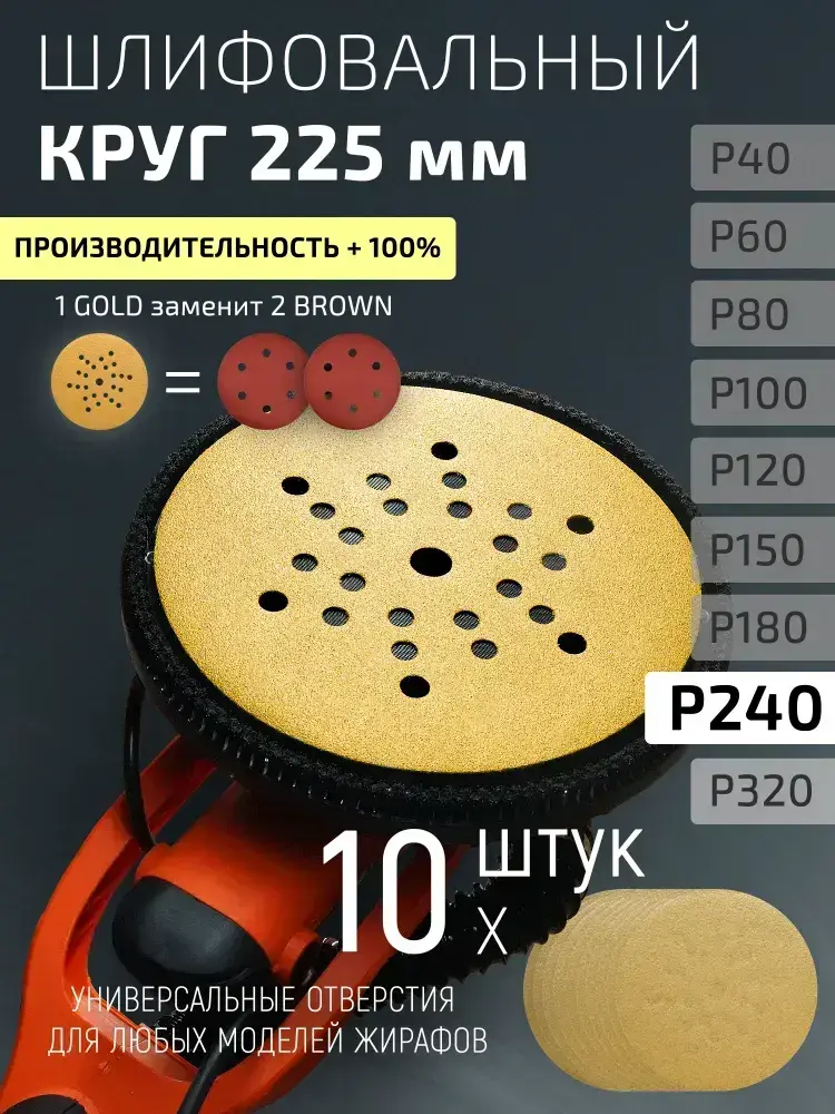 225мм P240 10шт. Шлифовальный абразивный круг для шлифовки под липучку Minamo Golden Warrior