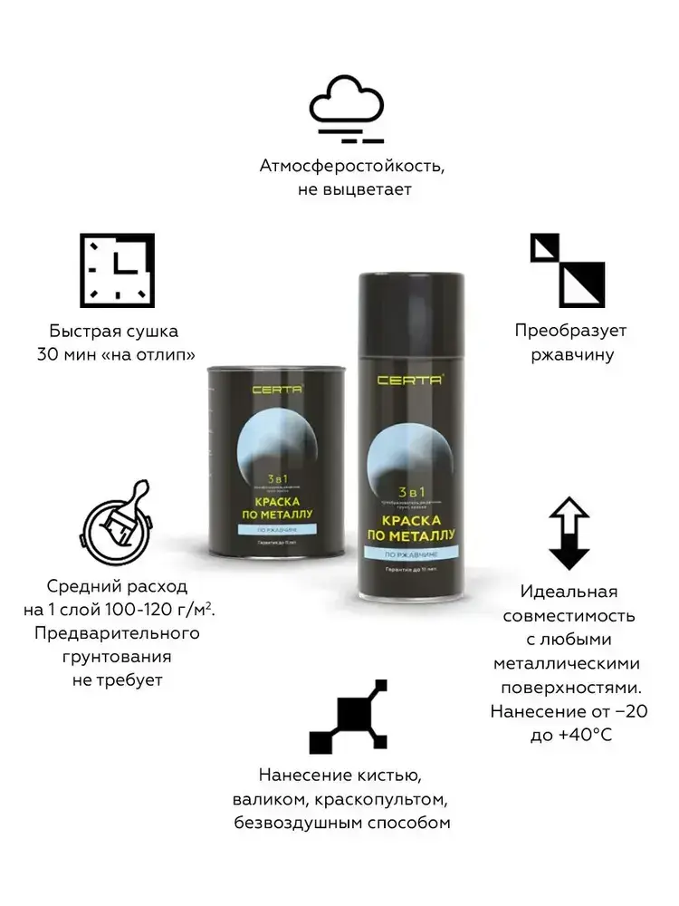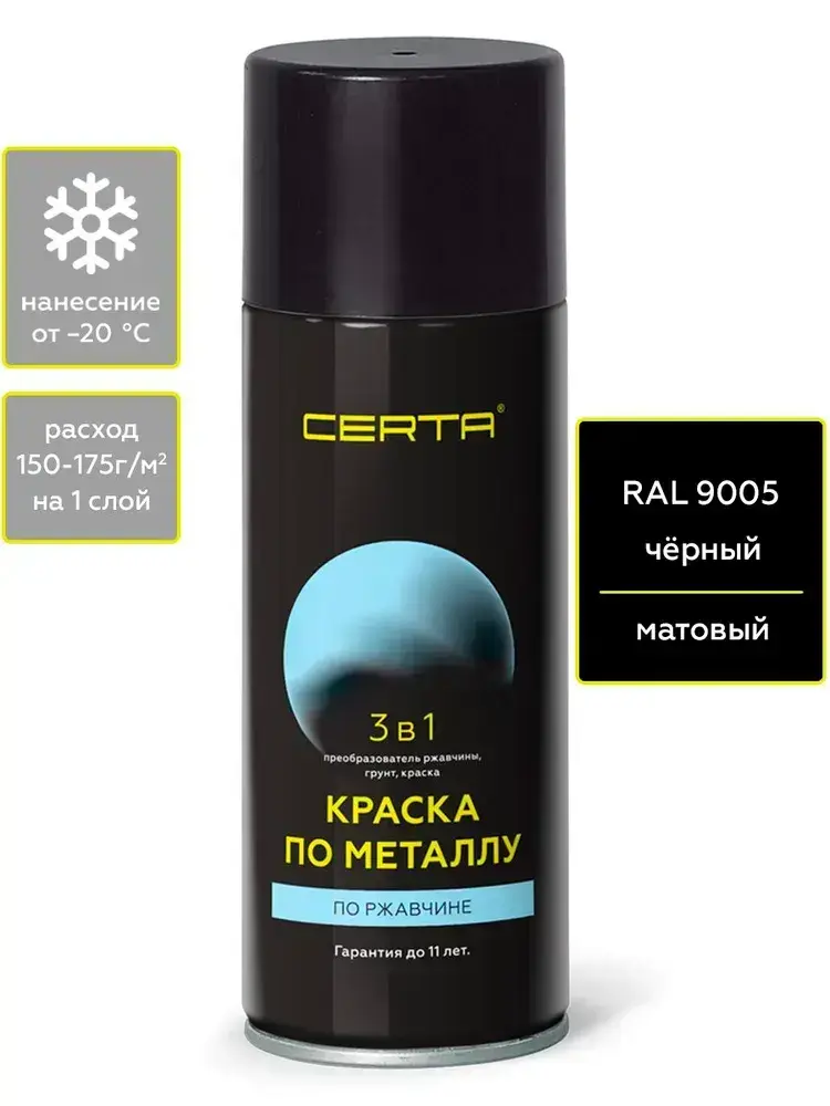Аэрозольная краска CERTA 3 в 1, грунт-эмаль по металлу, по ржавчине, быстросохнущая, матовое покрытие, черная, RAL 9005, 0.27 кг