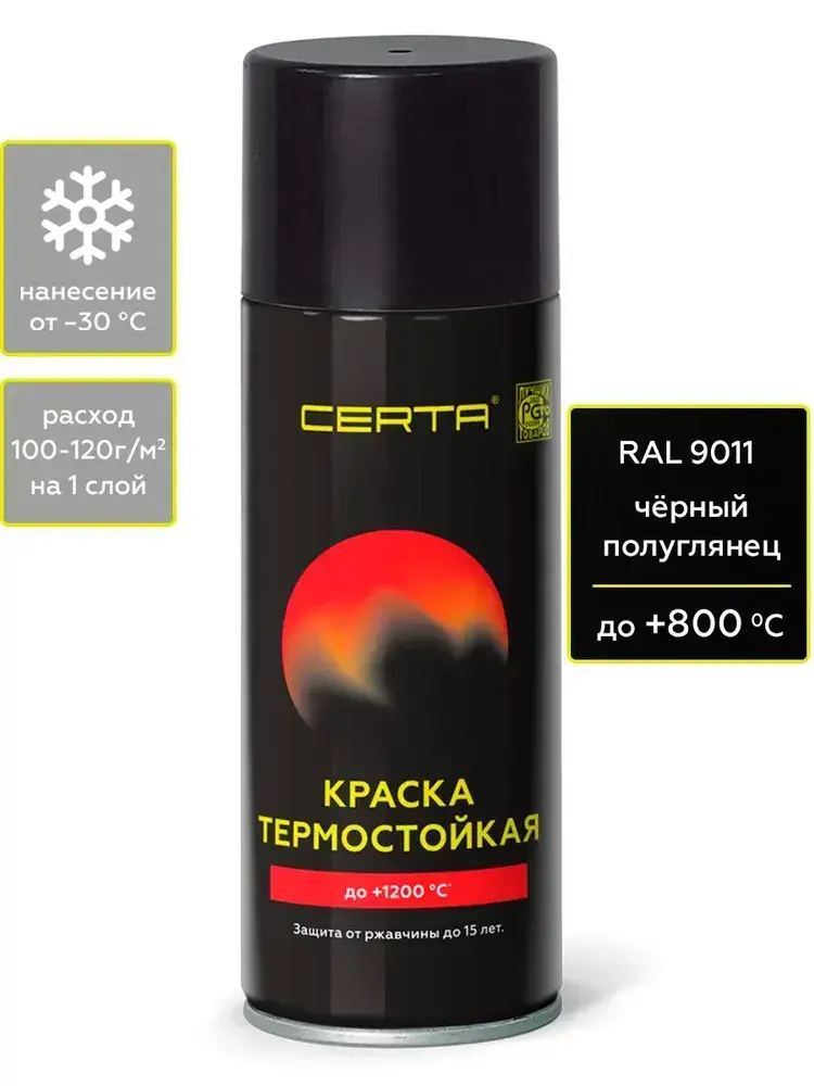Аэрозольная краска CERTA термостойкая до 800 градусов, антикоррозионная, для печей и мангалов, радиаторов, дымоходов,полуглянцевое покрытие, черная полуглянцевая, RAL 9011 аэрозоль 520 мл