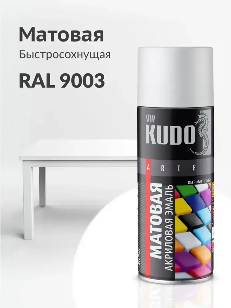 Аэрозольная краска KUDO "Эмаль универсальная быстросохнущая RAL в баллончике" Акриловая, Матовая, 0.52 л, Белая матовая RAL 9003