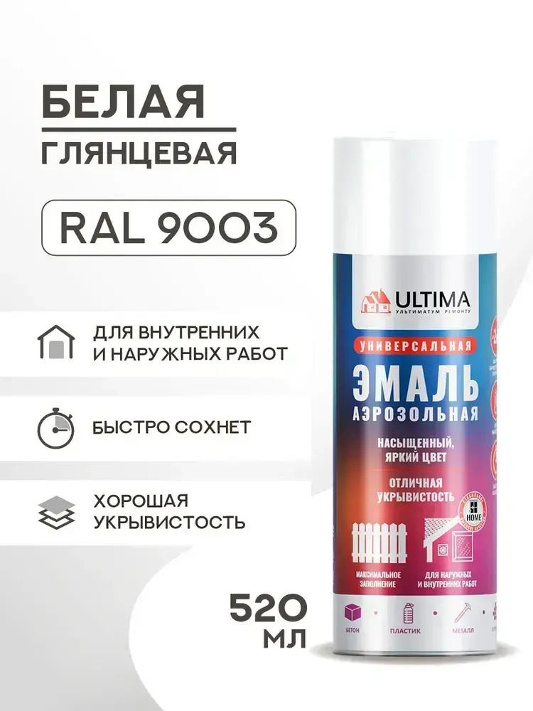 Аэрозольная краска в баллончике ULTIMA Белая глянцевая RAL9003, 520мл, ULT009