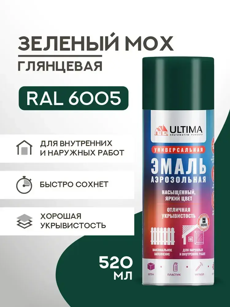 Аэрозольная краска в баллончике ULTIMA Зеленый мох RAL6005, 520мл, ULT033
