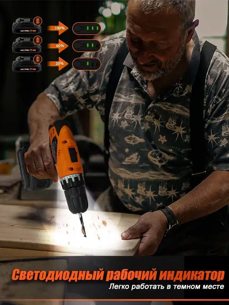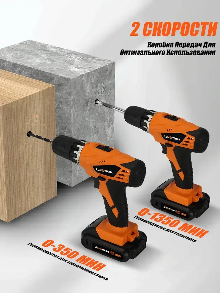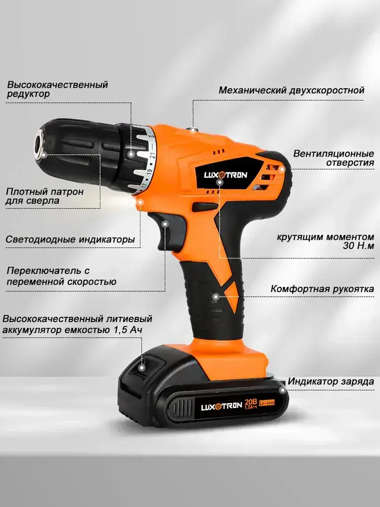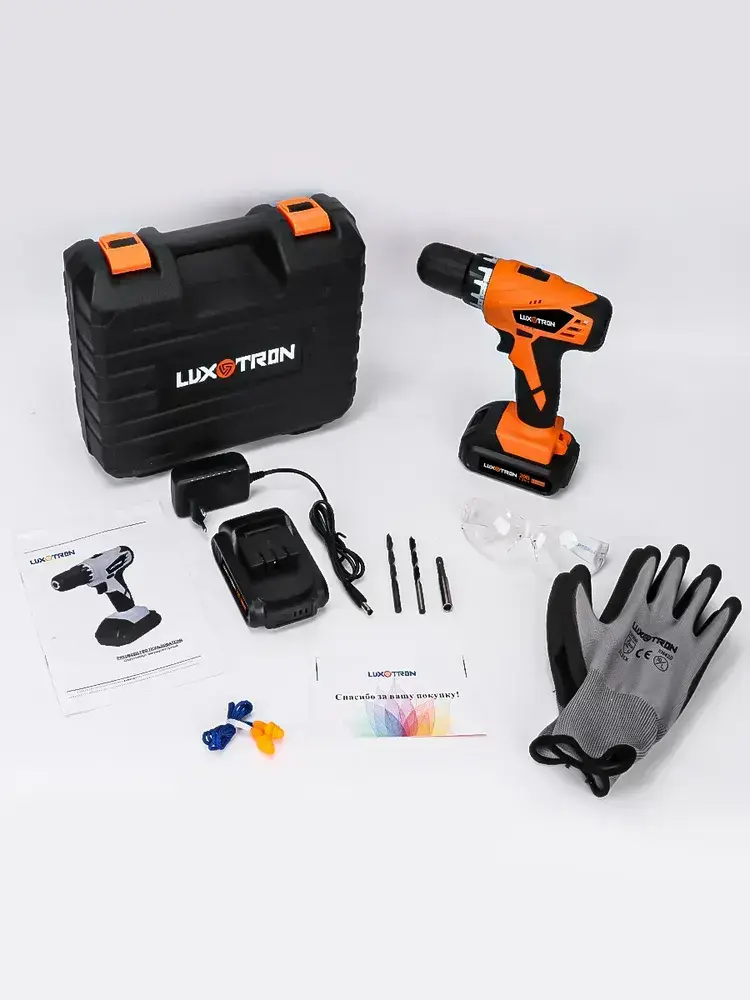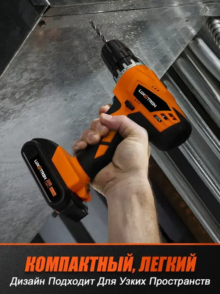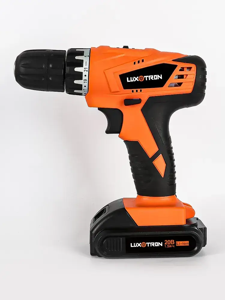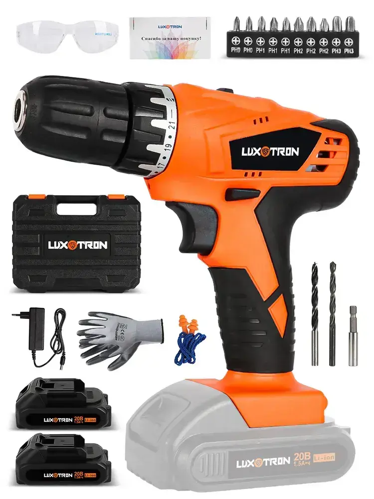 Аккумуляторная дрель-шуруповерт Luxotron, 20 В, 20+1 крутящий момент, 30 Н.м макс, 2 аккумулятора и светодиодная рабочая подсветка