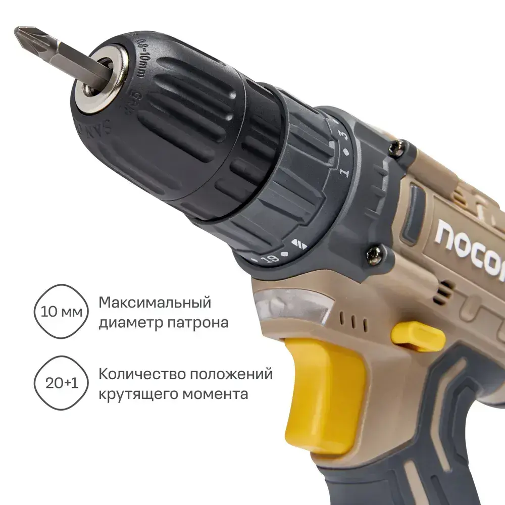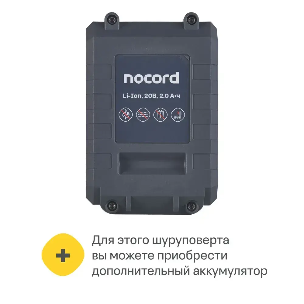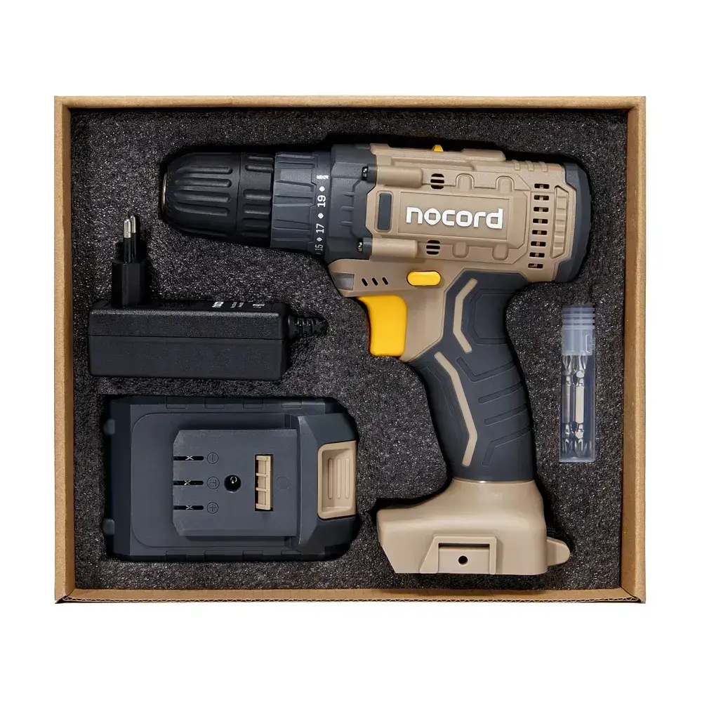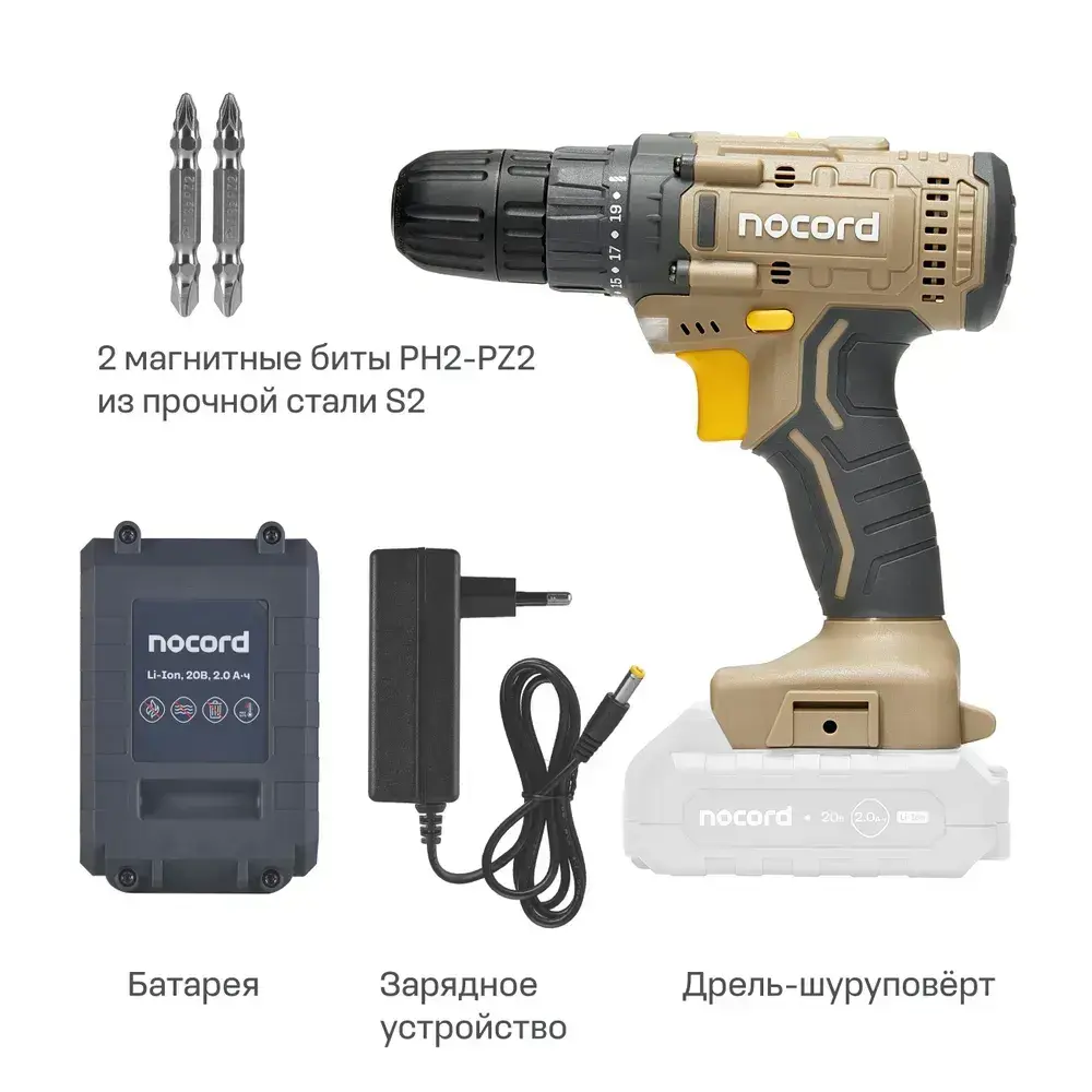 Аккумуляторная дрель-шуруповерт Nocord, 20В, 1х2.0 А ч Li-Ion, в коробке + 2 биты, NСD-20.1.20.В