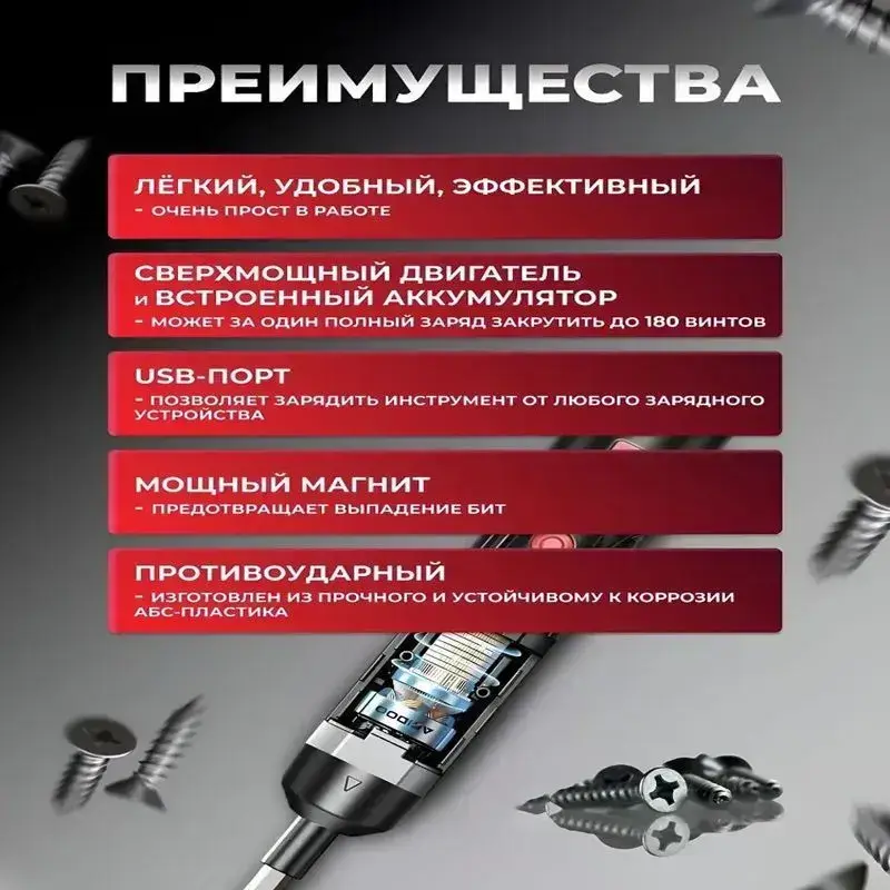 Аккумуляторная электрическая отвертка, биты в комплекте,