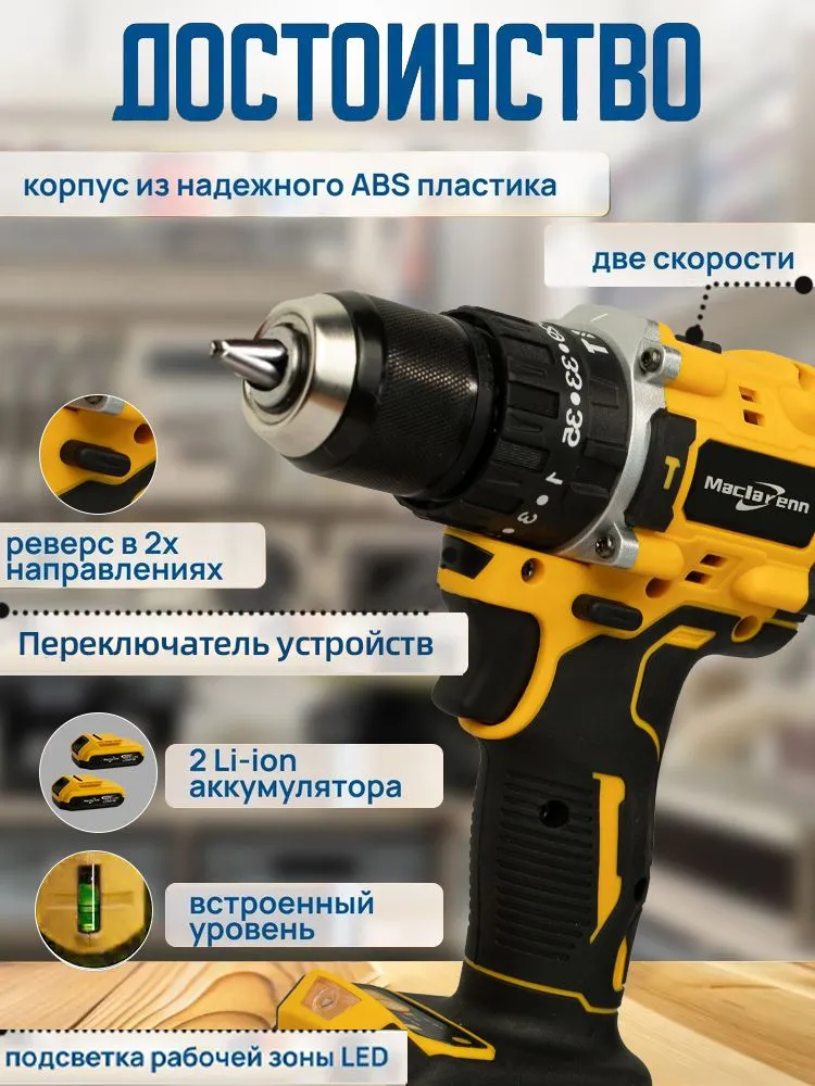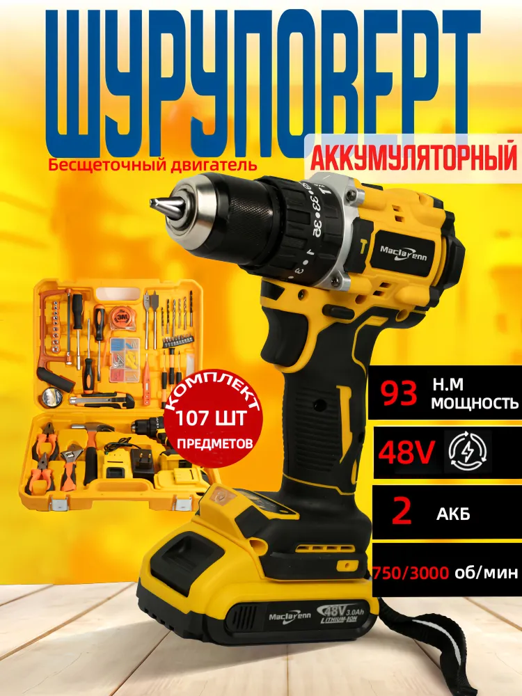 Аккумуляторный бесщеточная дрель-шуруповерт 48V с набор бит и двумя аккумуляторами 3 Ач