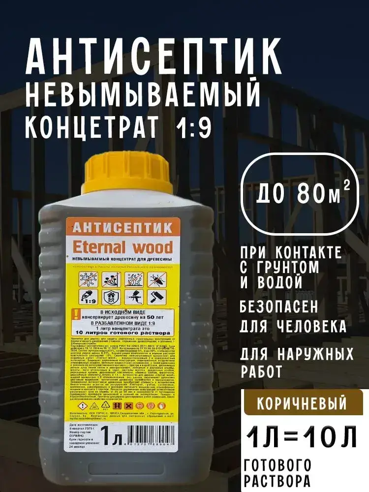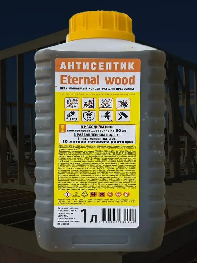 Антисептик для дерева невымываемый концентрат 1:9 Eternal Wood/ пропитка для дерева для наружных работ/ биозащитная обработка древесины от гниения 1л