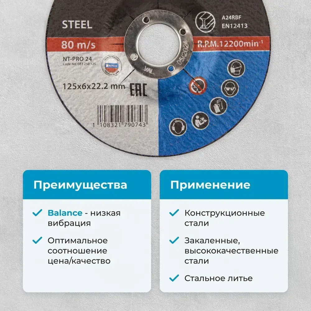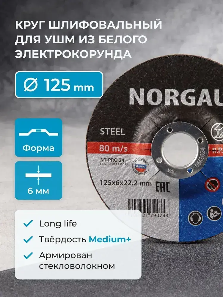 Армированный зачистной шлифовальный диск NORGAU Industrial средней твердости по стали для УШМ/болгарки 125х6.0 мм