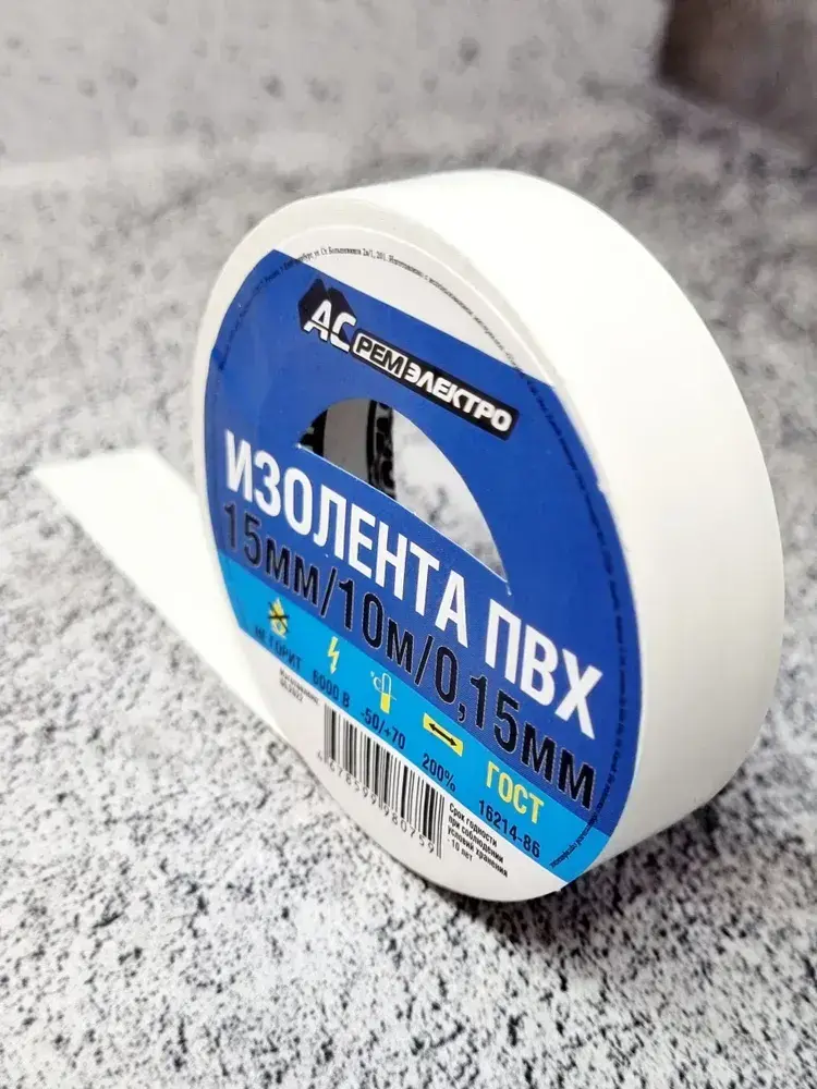 АС РемЭлектро Изолента ПВХ 15 мм 10 м 150 мкм, белая, 1 шт.