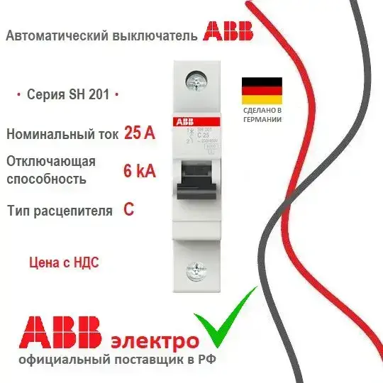 Автоматический выключатель ABB SH201 25A 6kA 1P тип С 2CDS211001R0254
