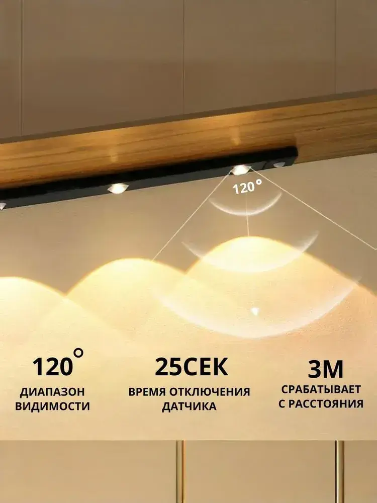 Беспроводной светодиодный светильник с датчиком движения на клипсах, настенный, потолочный, 600 мм, лампа на аккумуляторе (черный 3000-6000К)