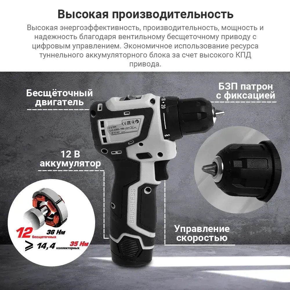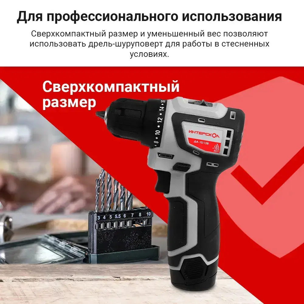 БЕСЩЕТОЧНАЯ аккумуляторная дрель-шуруповерт ИНТЕРСКОЛ ДА-10/12В МиниМАКС ДА-10/12В (Li-ion, картон, 2 аккум., 1,5Ач) 687.1.2.70