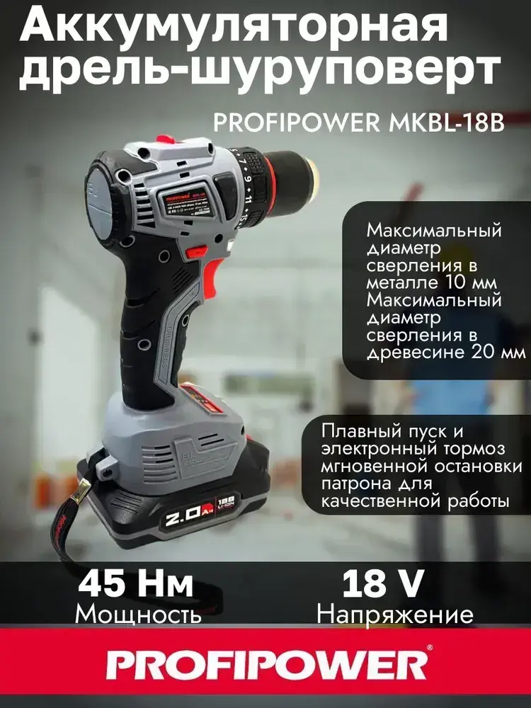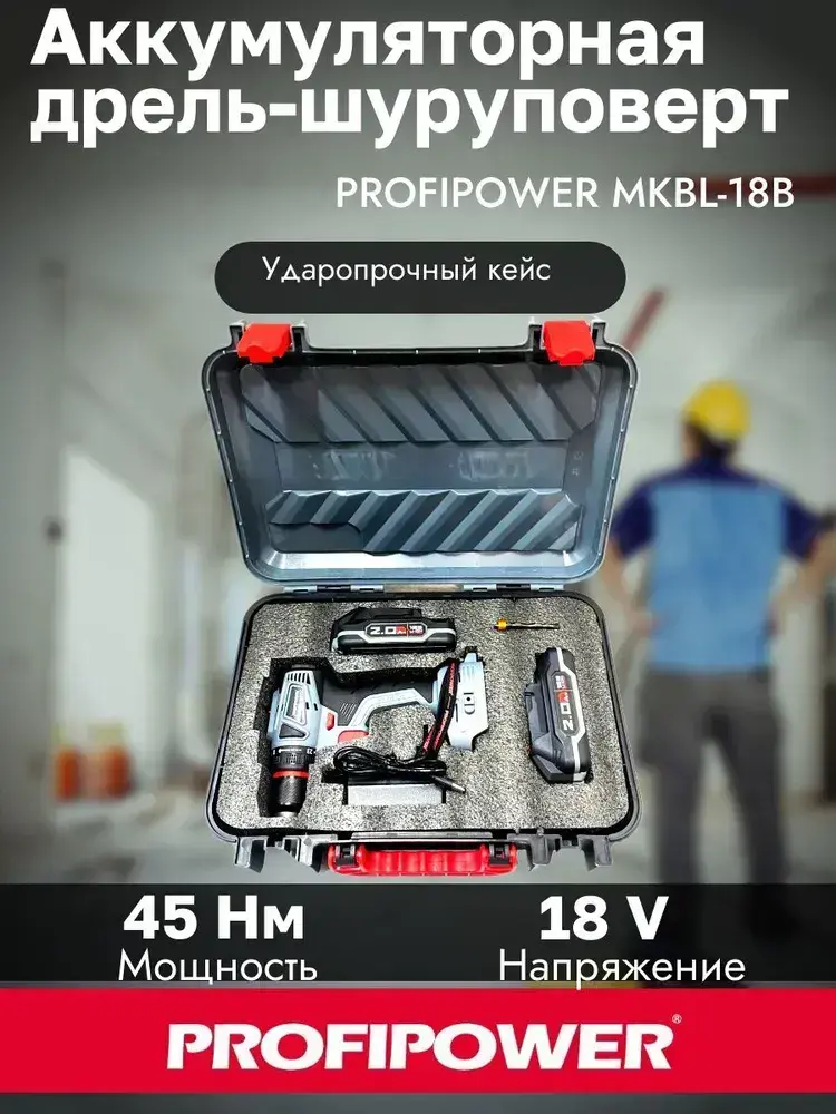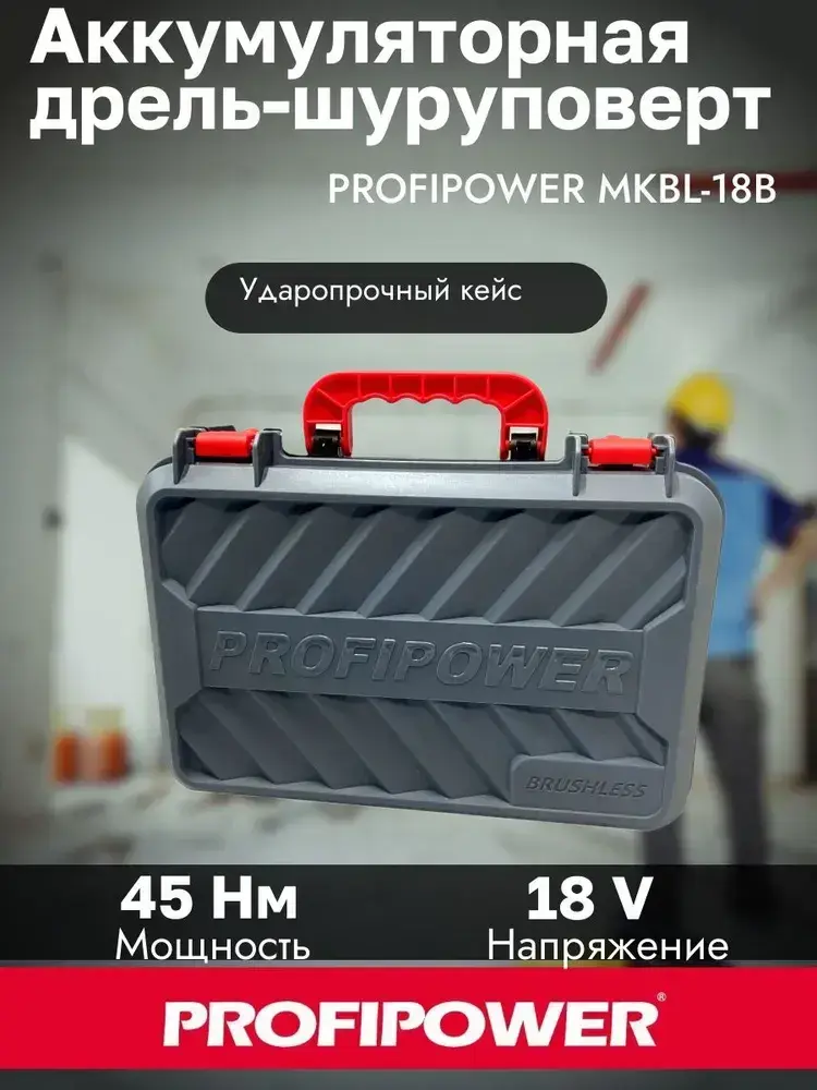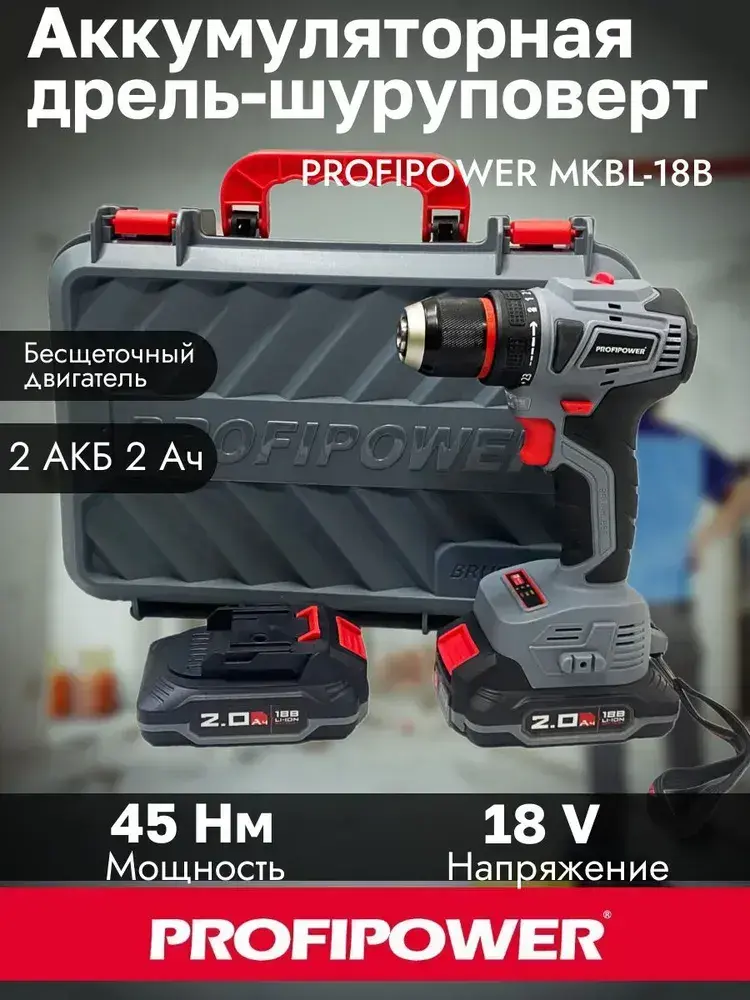 Бесщеточный аккумуляторный шуруповерт PROFIPOWER MK-BL18B 18В 45Нм 2*2Ач АКБ Кейс