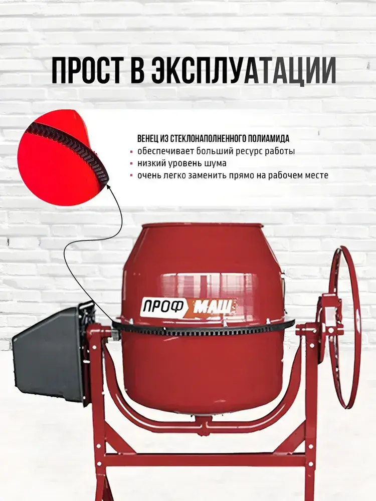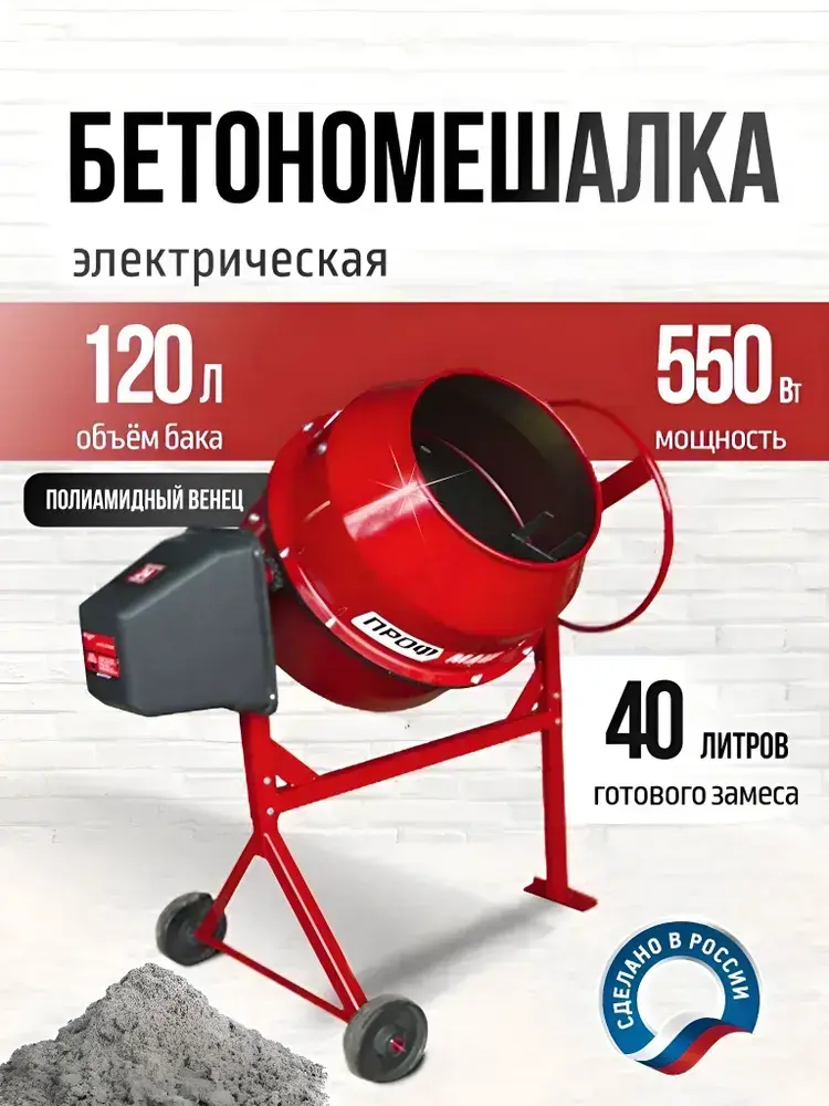 Бетономешалка строительная, бетоносмеситель ПРОФМАШ Б-120 550 Вт, 120л полиамидный венец