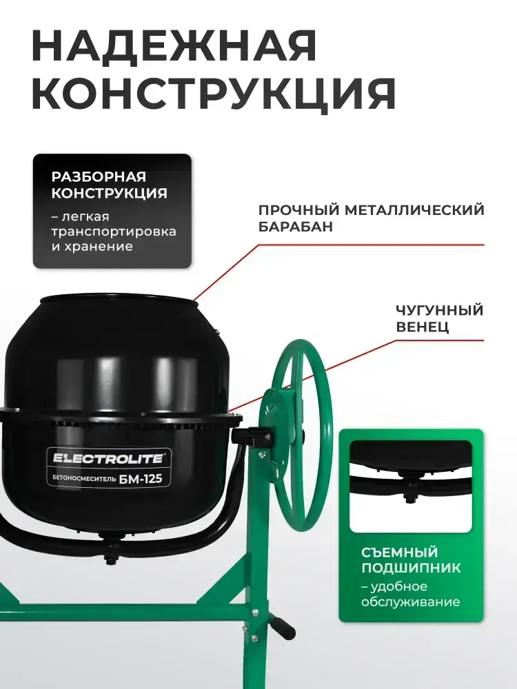 Бетономешалка строительная Electrolite 125л, чугунный венец