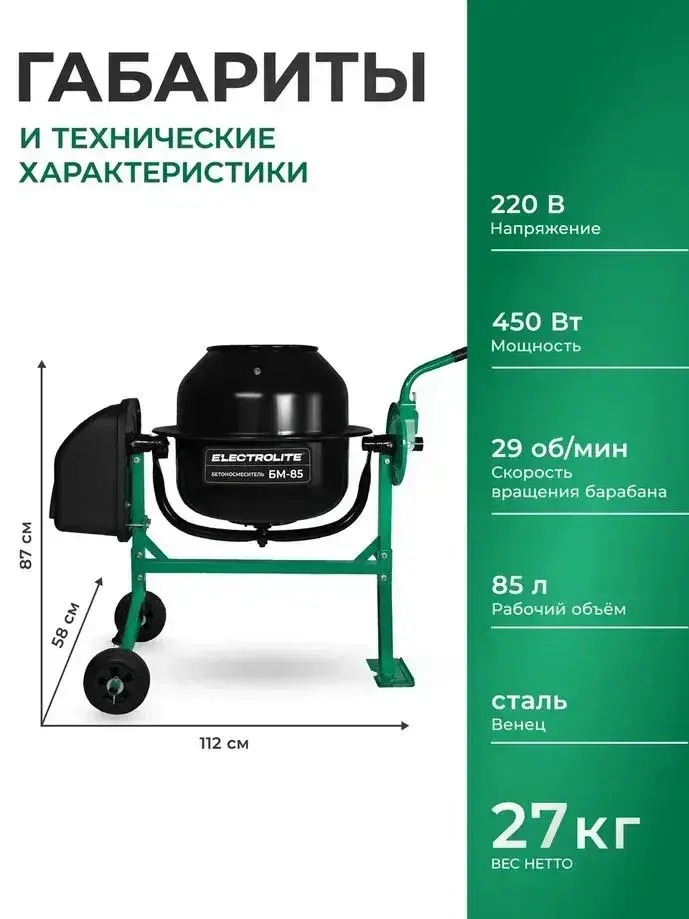 Бетономешалка строительная Electrolite 85л, стальной венец