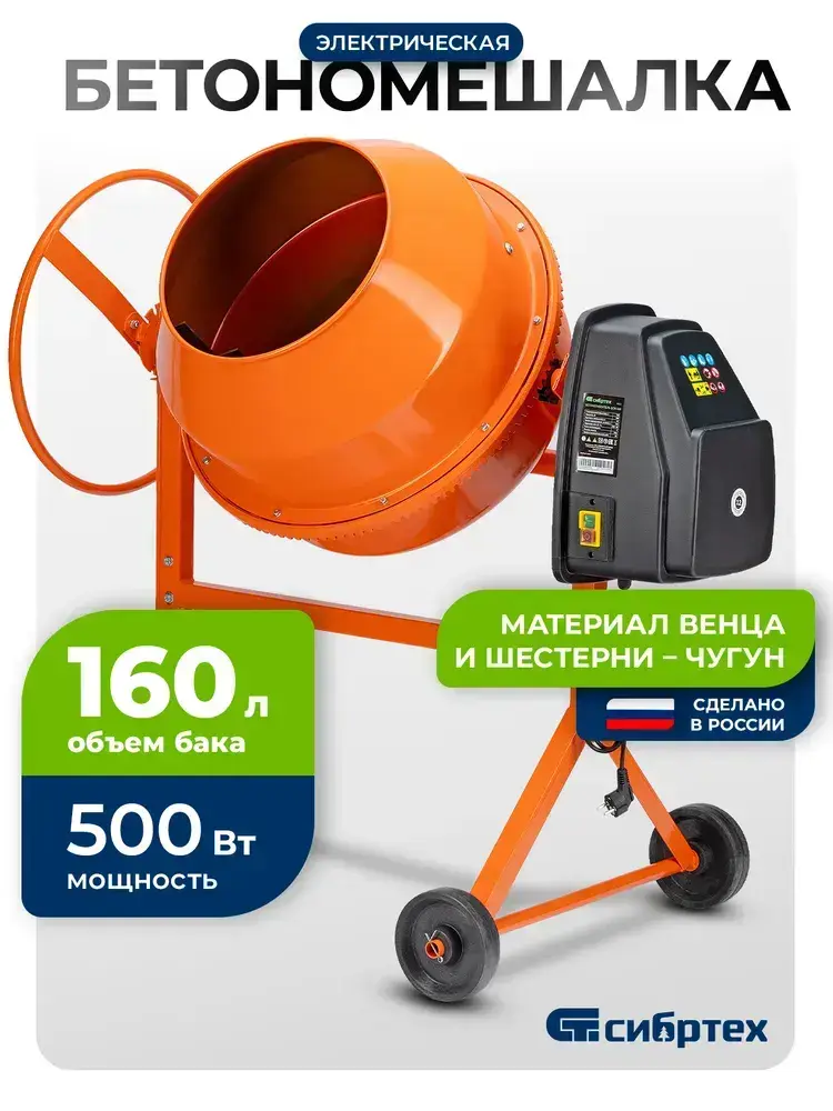 Бетономешалка строительная СИБРТЕХ, БСН-160, 160 л объем бака и 500 Вт мощность, чугунный венец и поликлиновый ремень, защита от перегрева и случайного пуска, без редуктора, бетоносмеситель, 95512