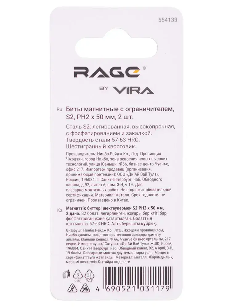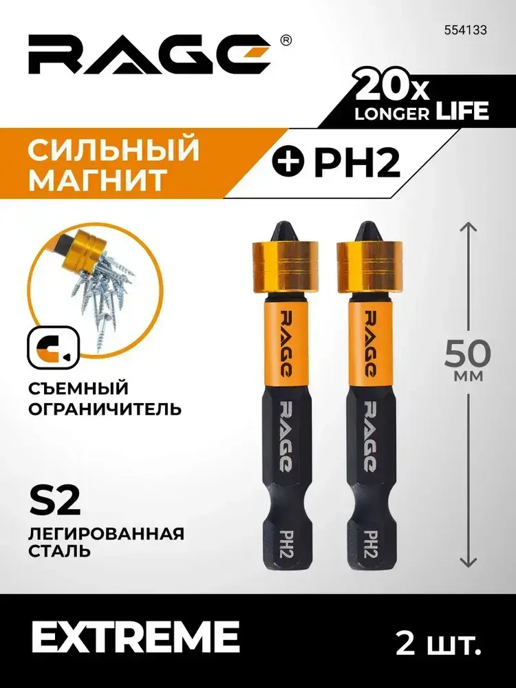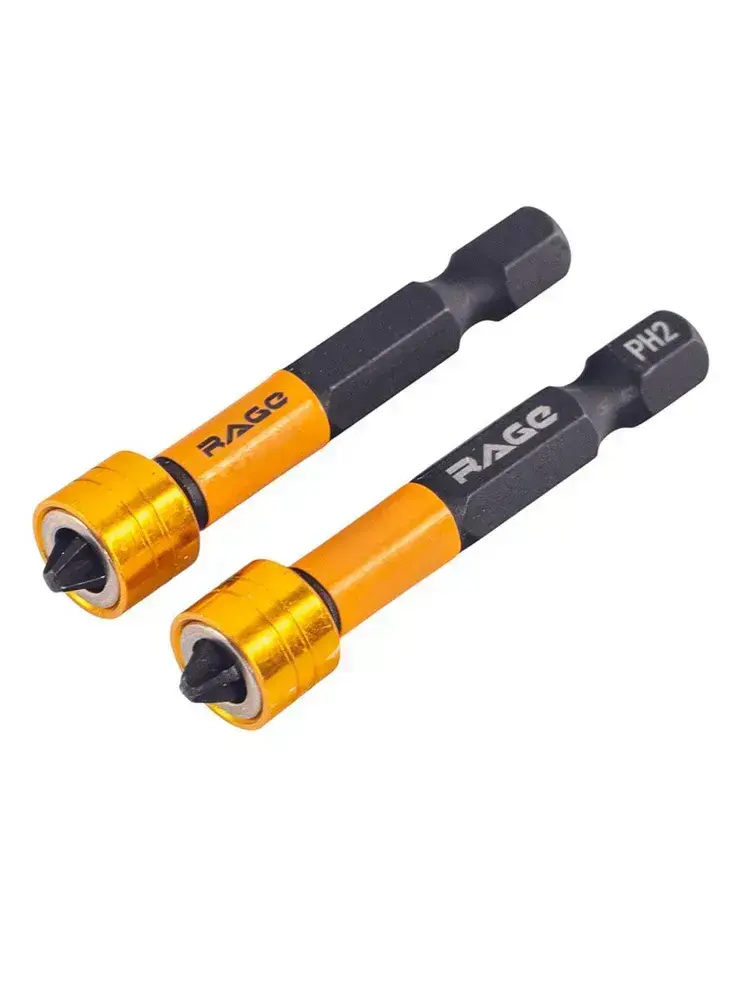 Биты с магнитным ограничителем PH2 x 50 мм 2 шт для ДСП гипсокартона RAGE by VIRA
