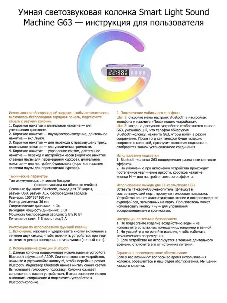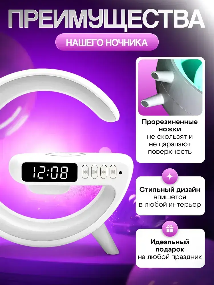 Блютуз колонка ночник с беспроводной зарядкой и подсветкой