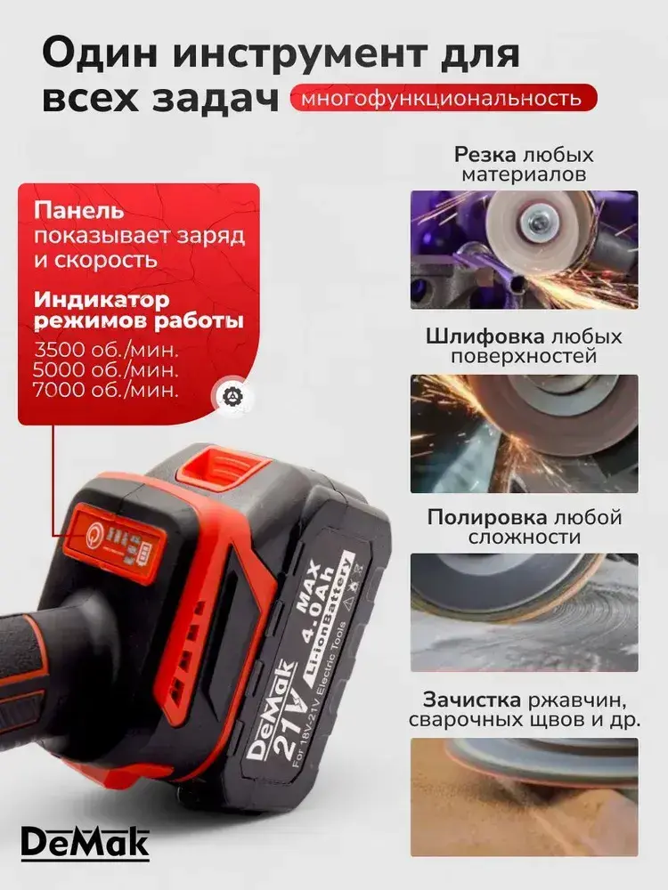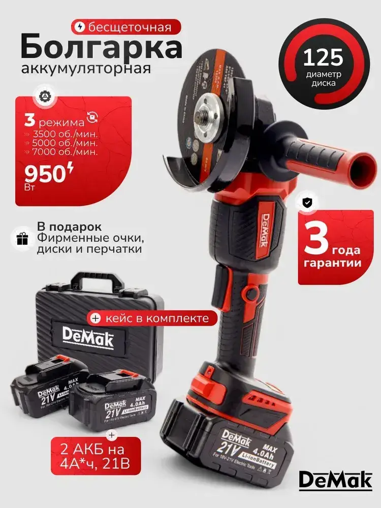 Болгарка аккумуляторная бесщеточная 125 с регулировкой оборотов электрическая в кейсе DeMak 21В