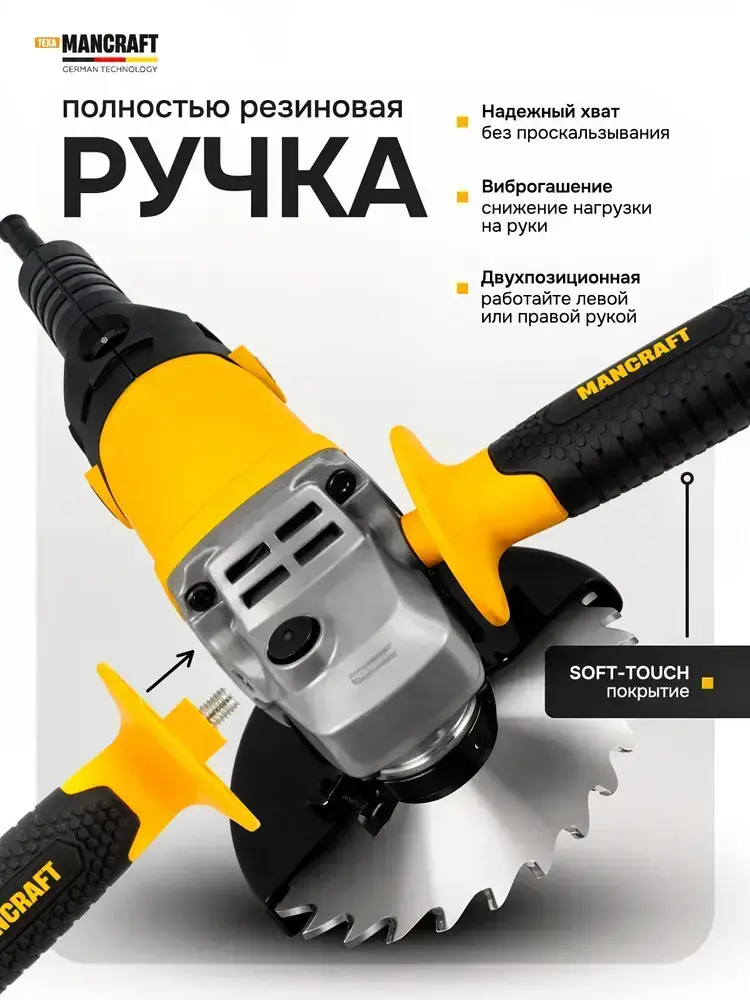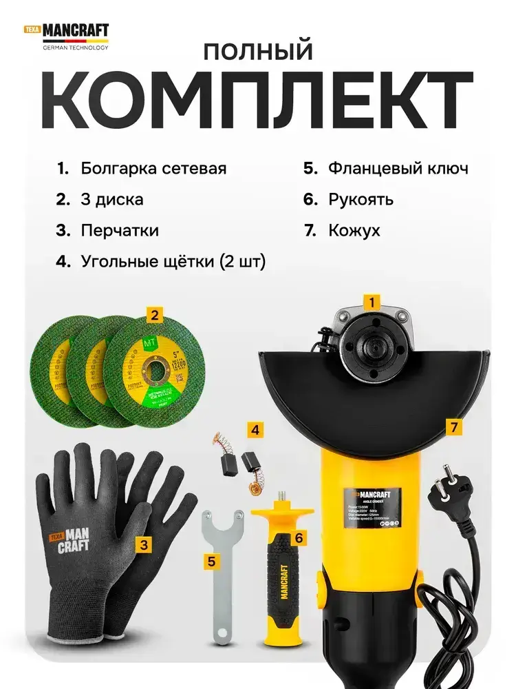 Болгарка сетевая (УШМ) MANCRAFT 1500Вт, болгарка 125 с регулировкой оборотов электрическая, 12000 об/мин