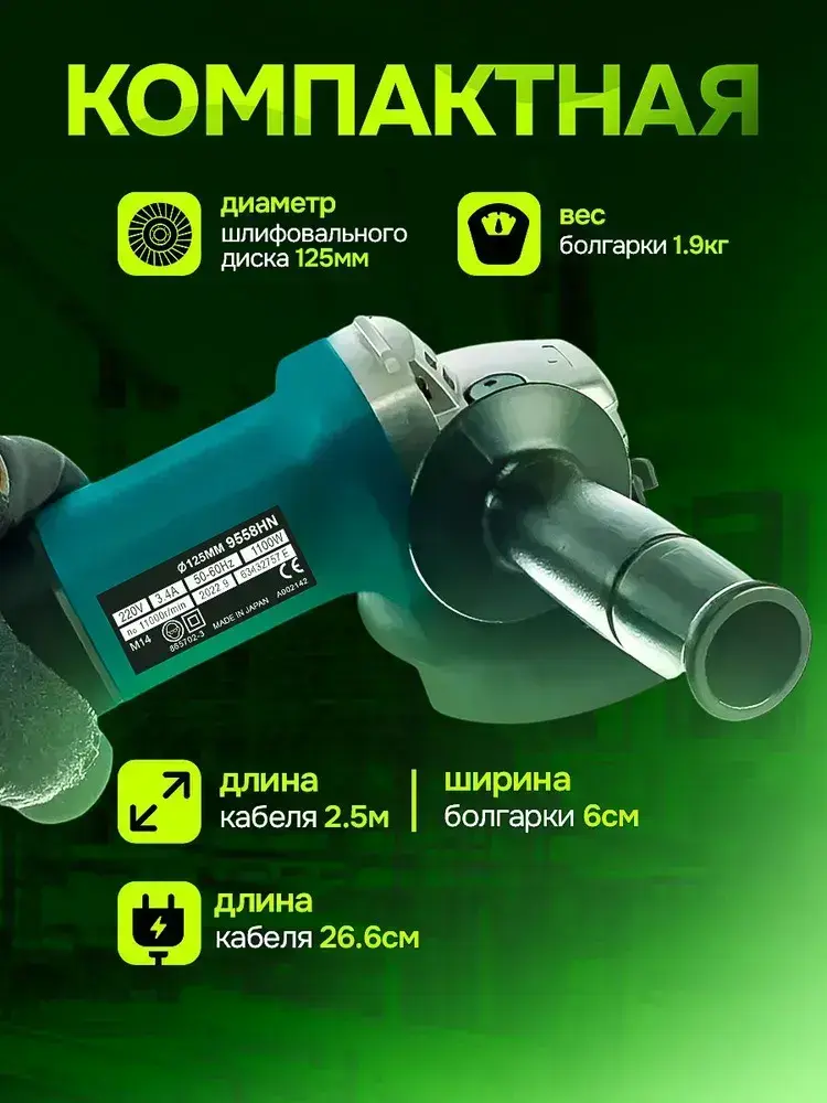 Болгарка УШМ 125мм с регулировкой оборотов 1100W, 9558, Угловая шлифовальная машина сетевая
