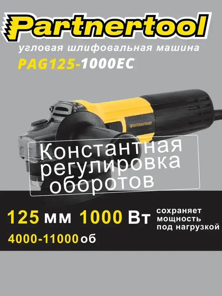 Болгарка (ушм - угловая шлифовальная машина с КОНСТАНТНОЙ РЕГУЛИРОВКОЙ ОБОРОТОВ ) БЕЗ КЕЙСА PAG125-1000EC Partnertool профессиональная серия