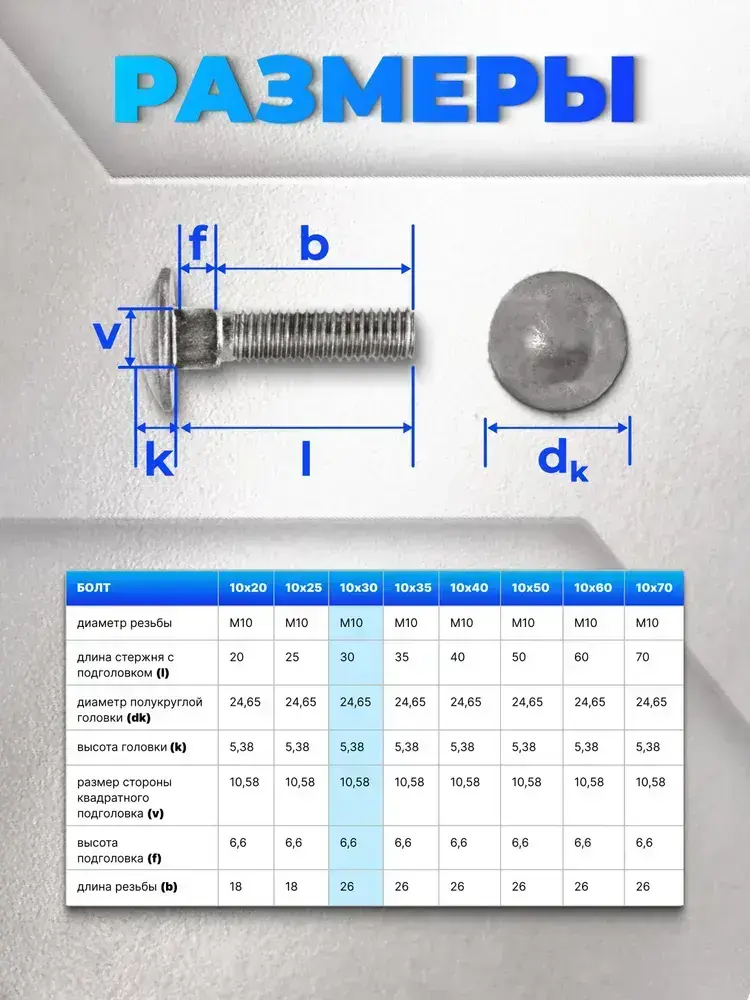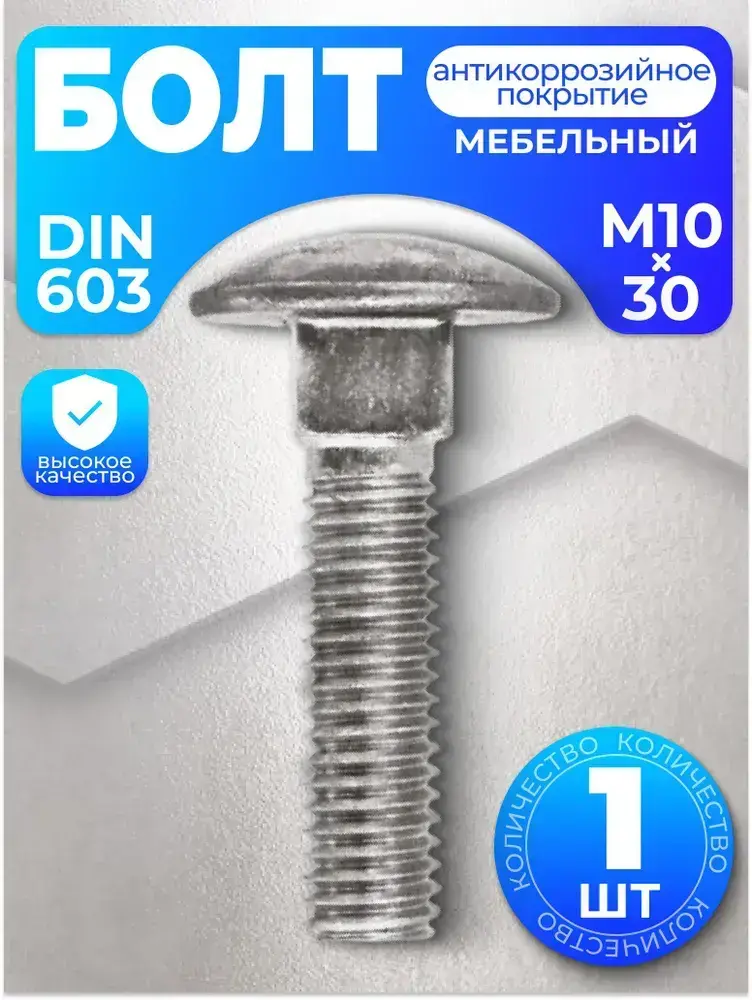 Болт мебельный М10х30 нержавейка DIN 603, 1 шт
