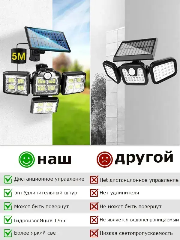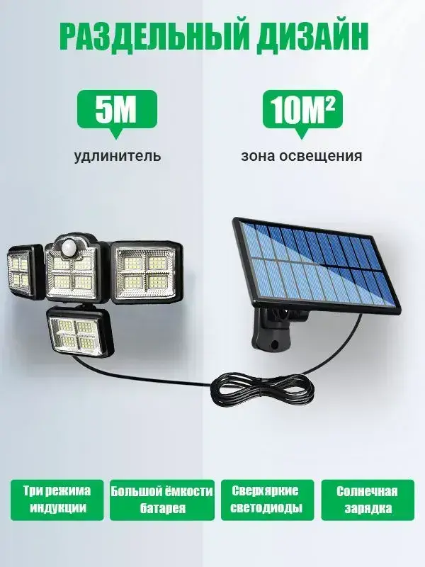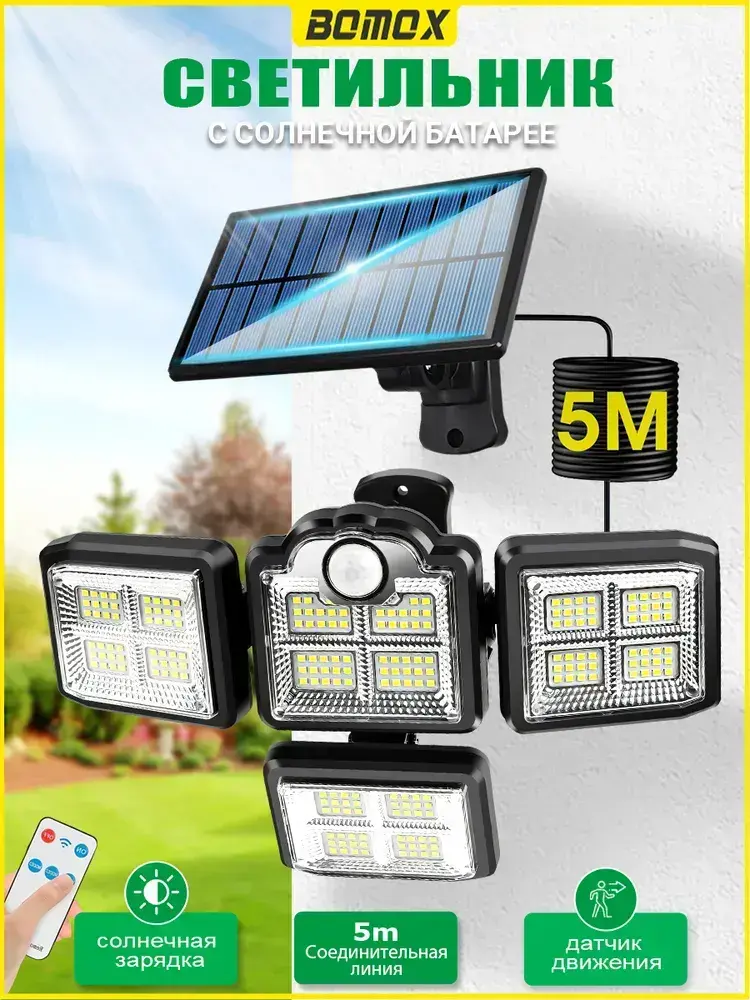 BOMOX Уличный светильник Светодиодный,С датчиком движения,Разделенная солнечная панель,Работает на батарейках,Пульт дистанционного управления, удлинительный кабель длиной 5 м