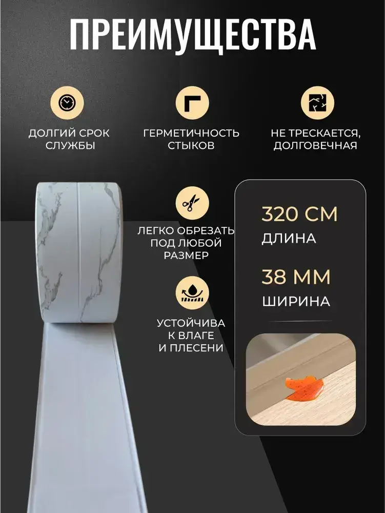 Бордюрная лента для ванны и кухни 38мм 3,2м белая мраморная.Самоклеящаяся декоративная лента,декоративный скотч.