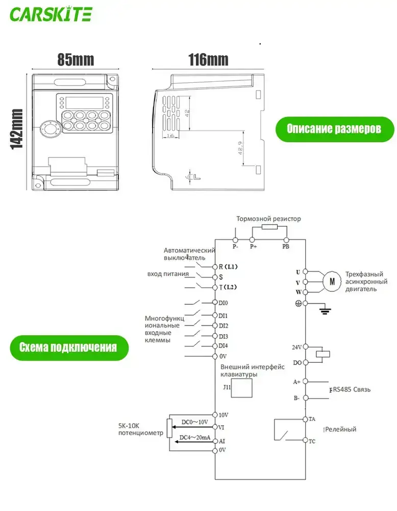 Частотный преобразователь 2,2 кВт 5,8A CARSKITE 380В Вход 3 Фазы Выход 3 Фазы