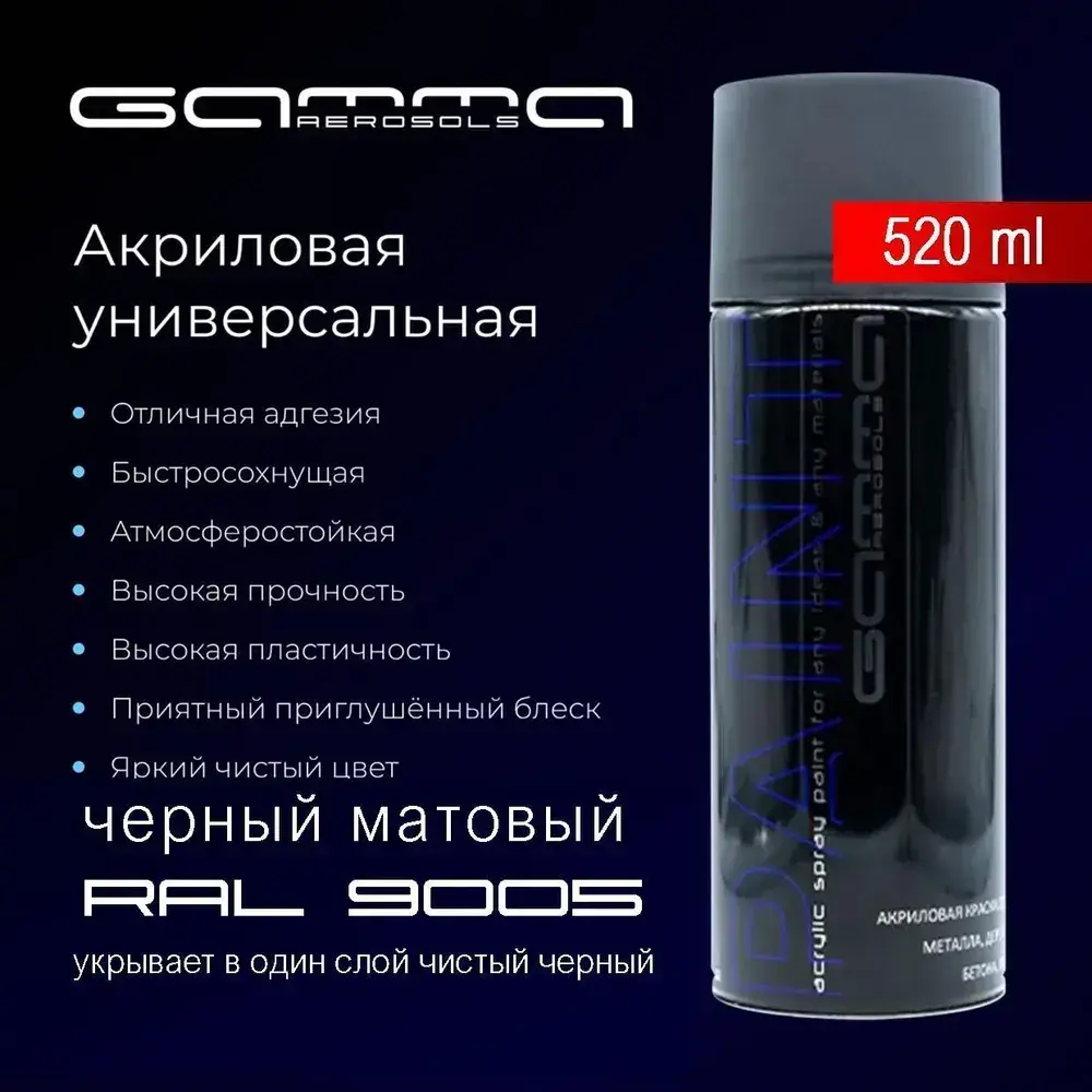 Черная матовая RAL 9005 акриловая 520мл краска аэрозольный баллончик Gamma Paint