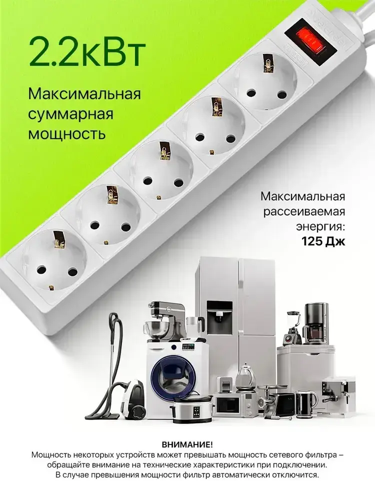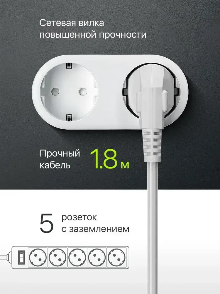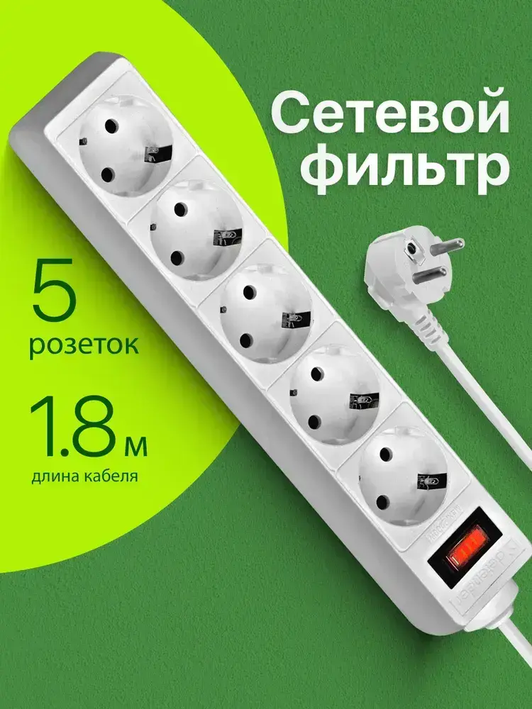 DEFENDER Сетевой фильтр с предохранителем 1.8м, 5 розеток с заземлением , белый