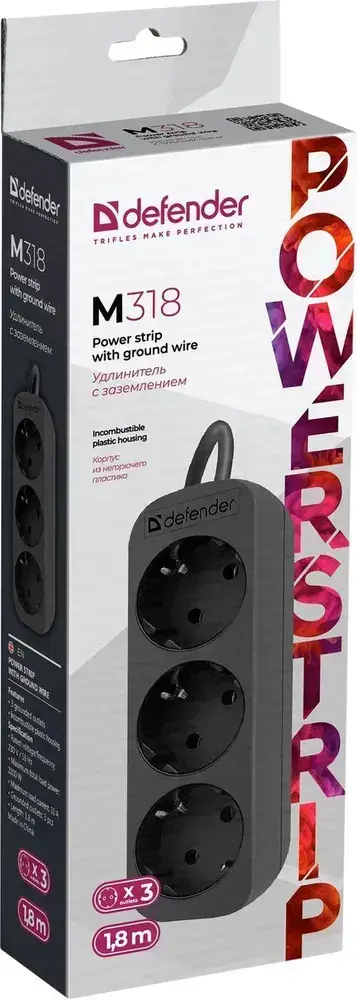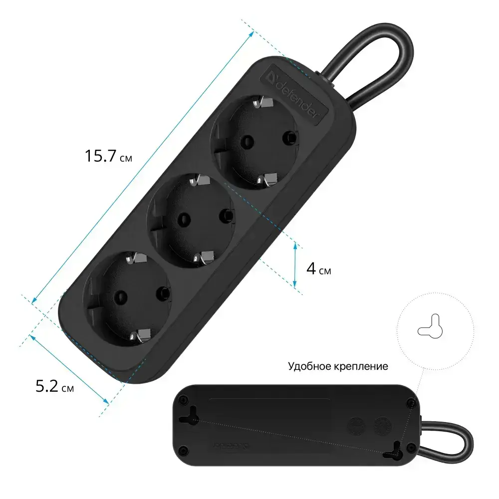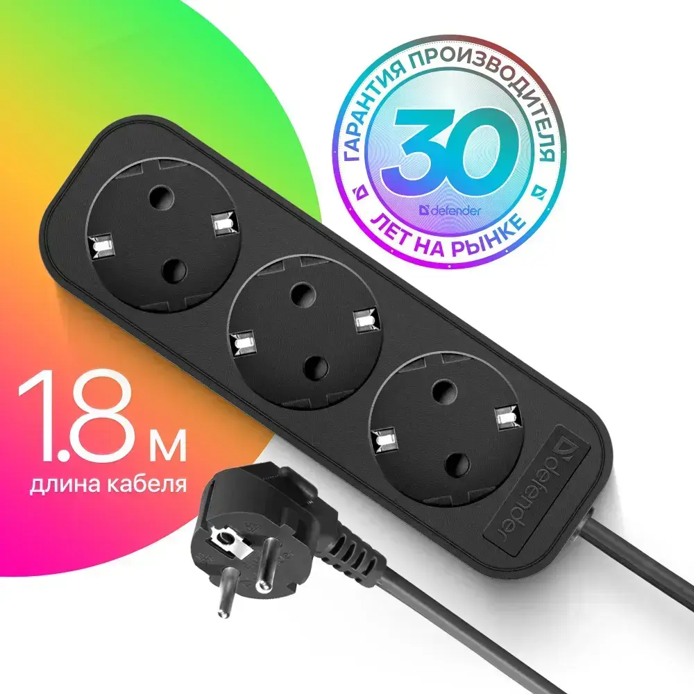 DEFENDER Удлинитель сетевой 3 розетки с заземлением , 1.8 метра , черный