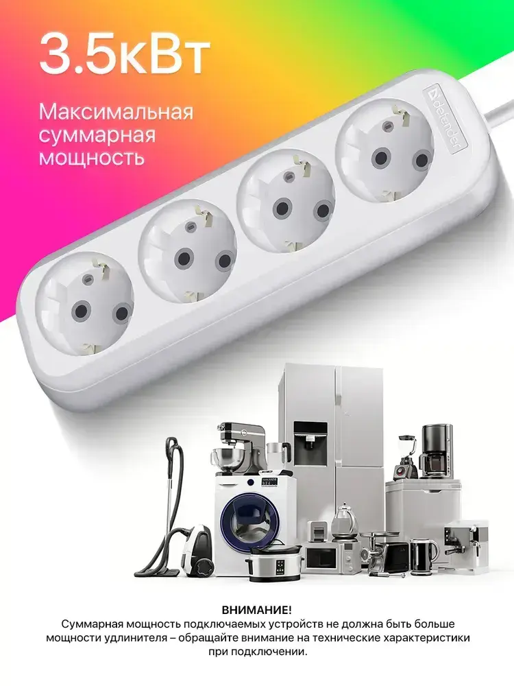 DEFENDER Удлинитель сетевой 3м, 4 розетки с заземлением, 16А