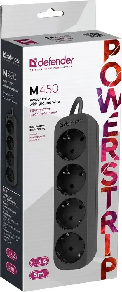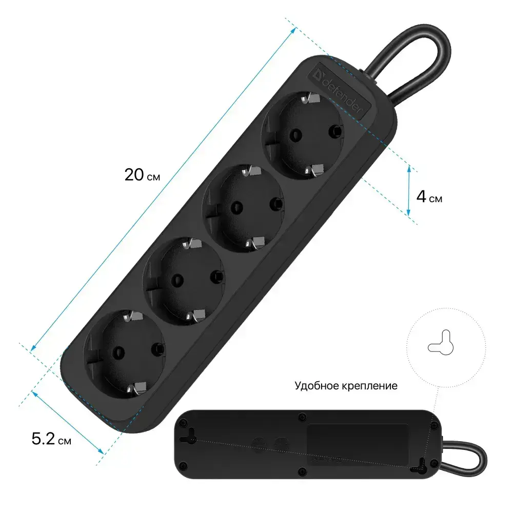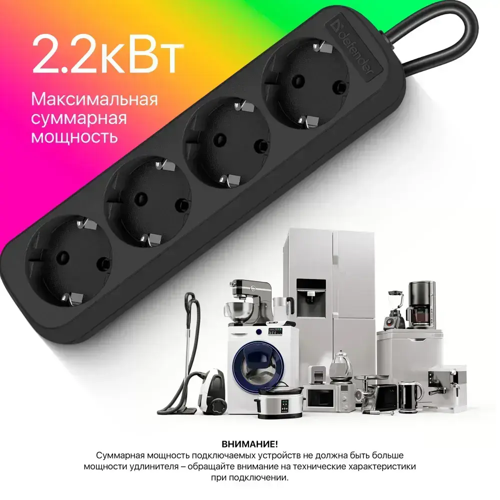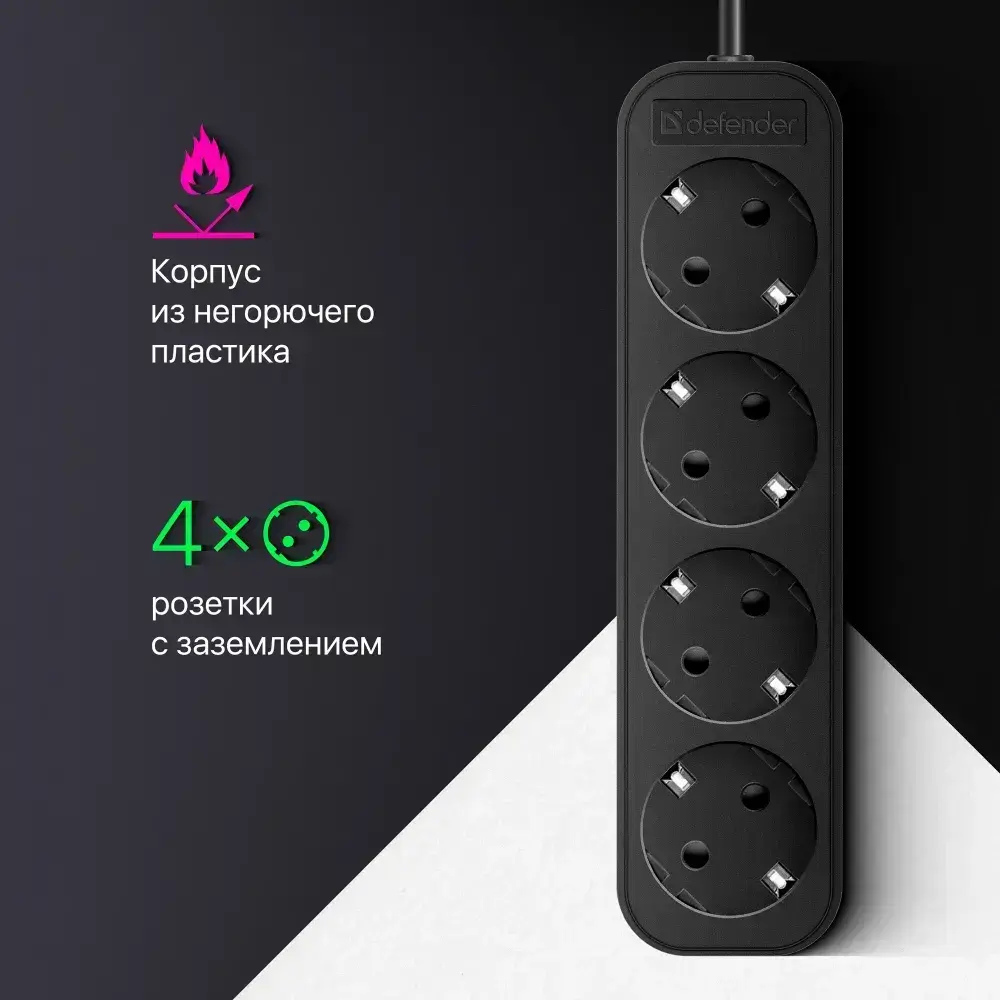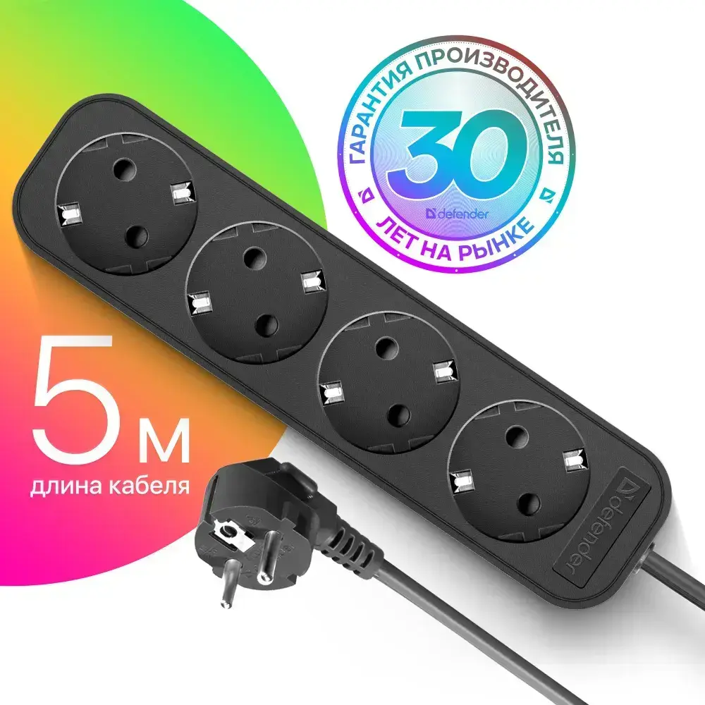 DEFENDER Удлинитель сетевой 4 розетки с заземлением , 5 метров , черный