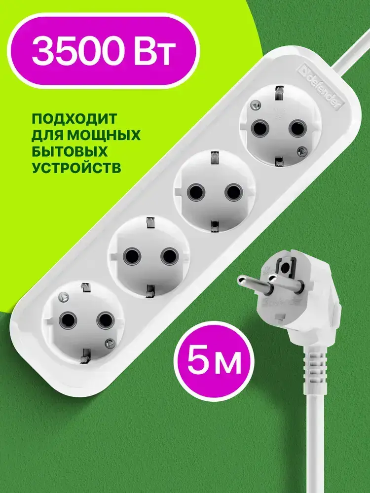 DEFENDER Удлинитель сетевой 5м, 4 розетки с заземлением, 16А