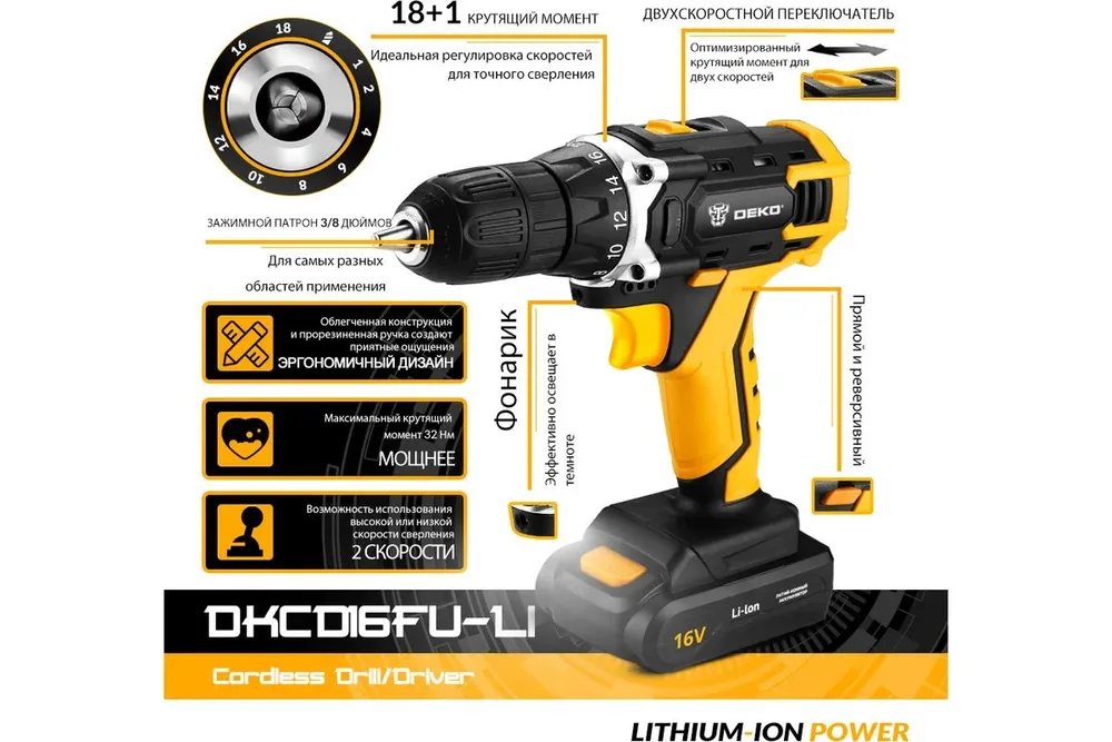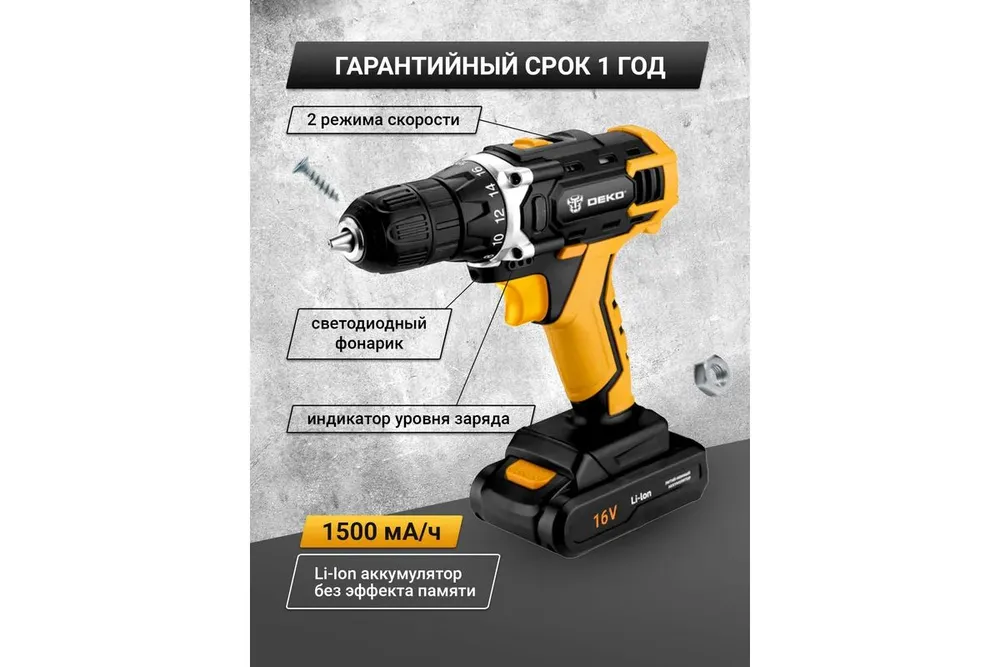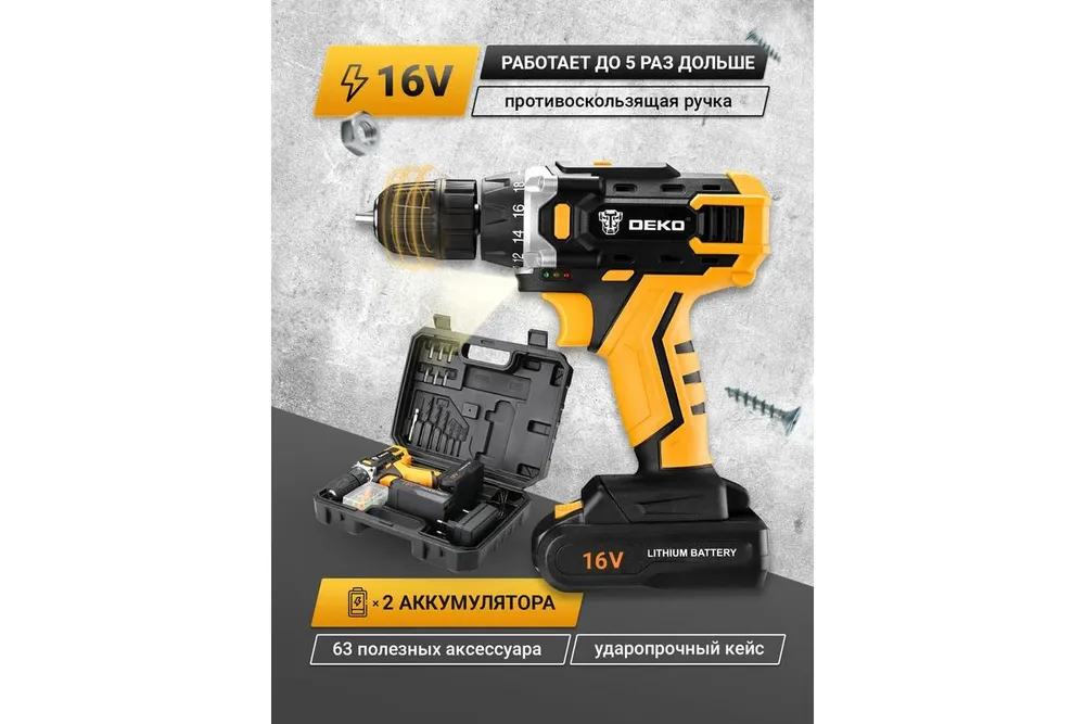 DEKO Дрель-шуруповерт, 16 В, 2 АКБ