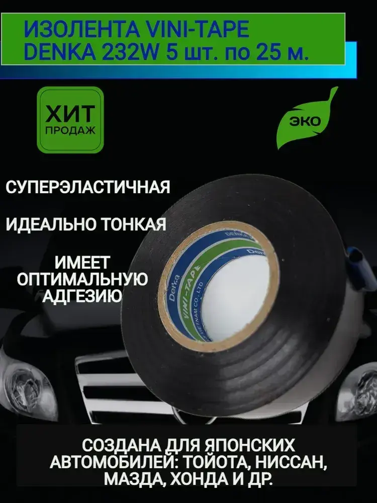 Денка 232w изолента ПВХ 5 шт. набор, изоляция автомобильная профессиональная черная тонкая глянцевая, 19 мм 25 м 100 мкм