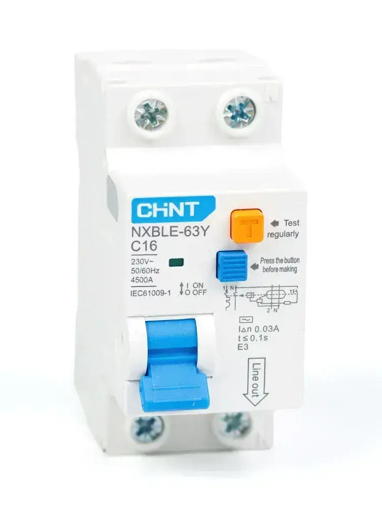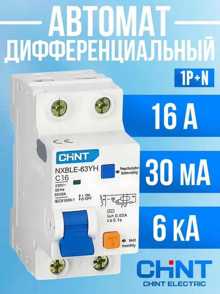 Дифференциальный автомат CHINT NXBLE-63Y 1P+N 16А 30мА электронный тип AС х-ка C 6кА