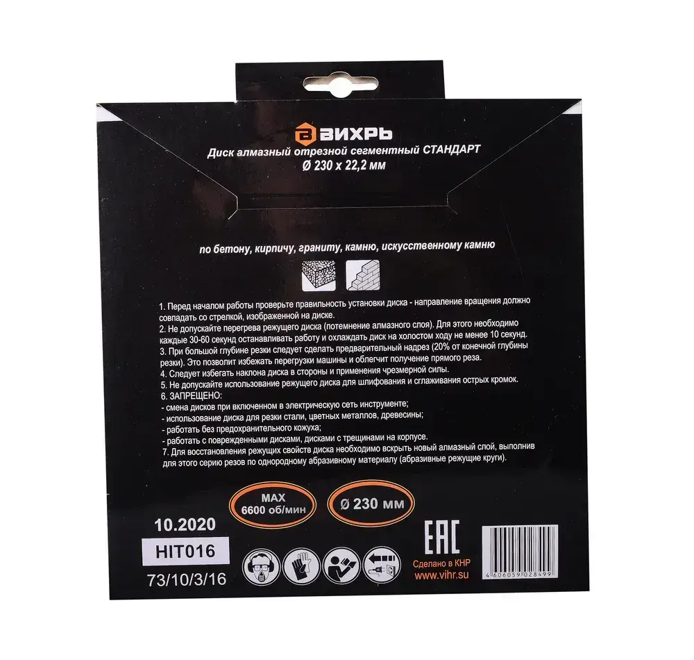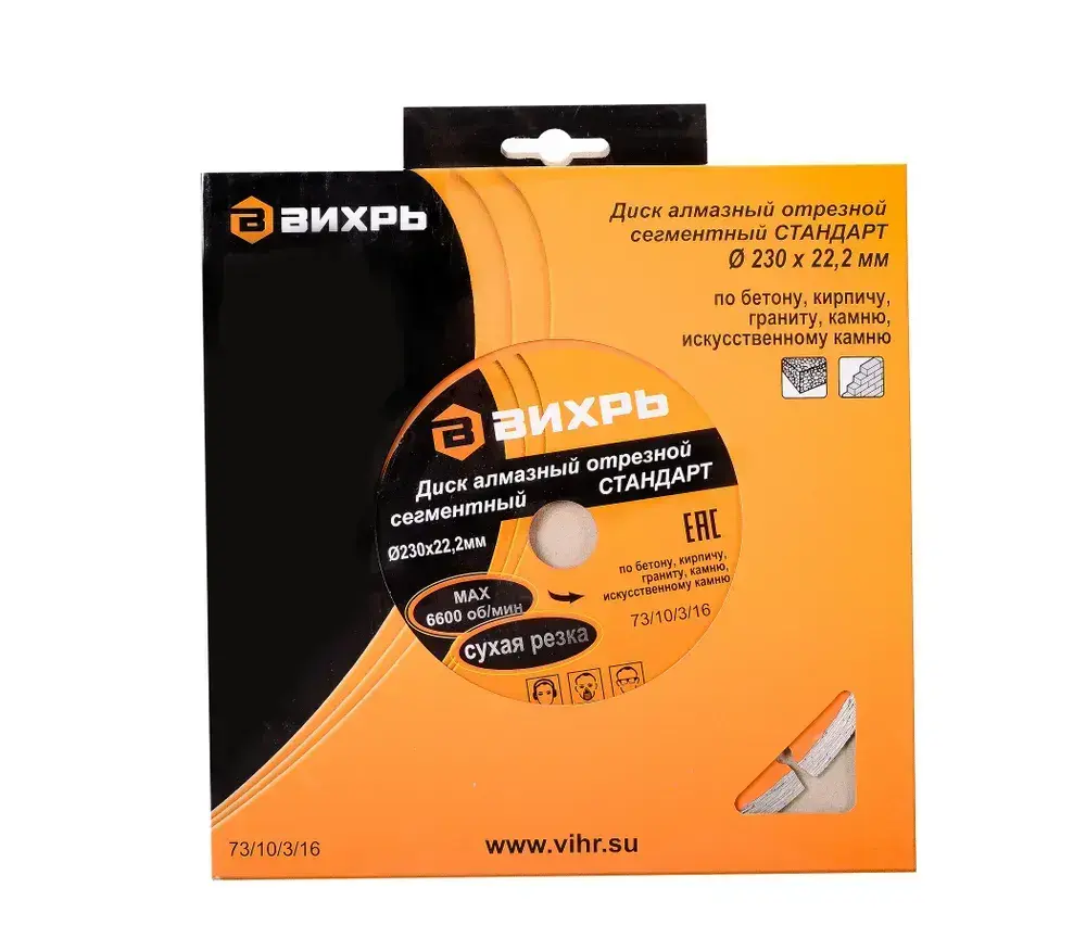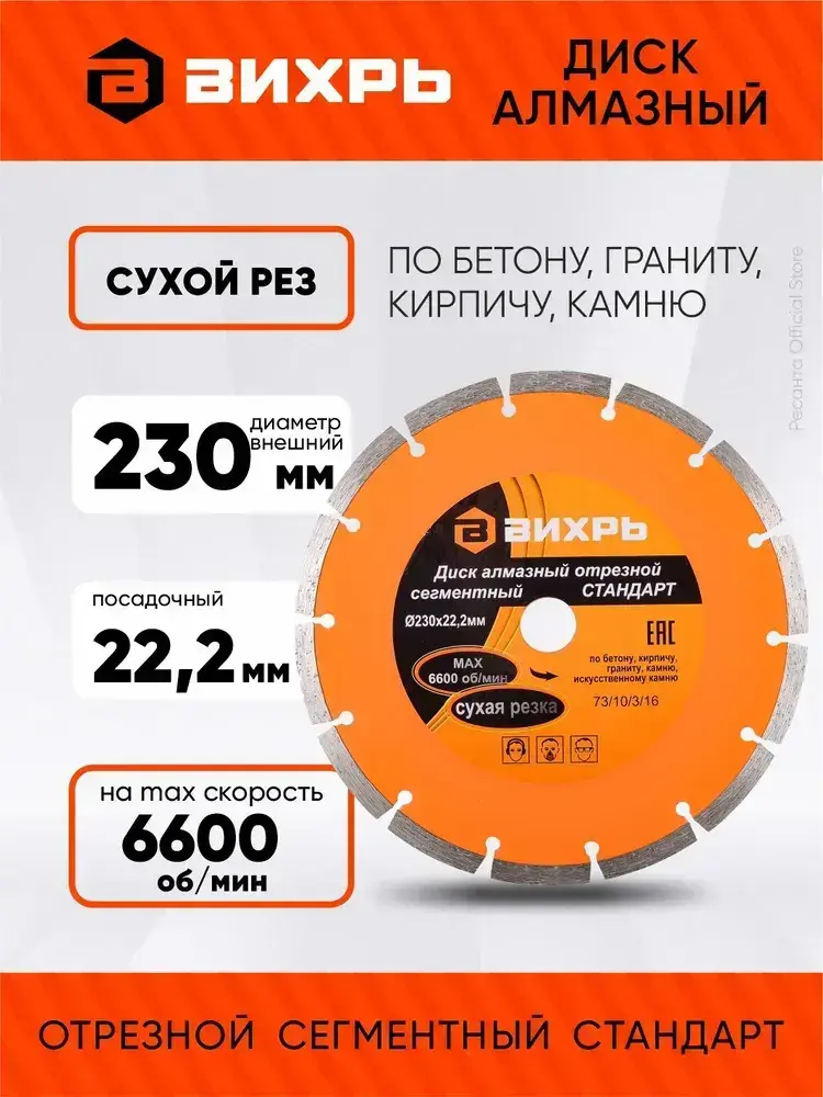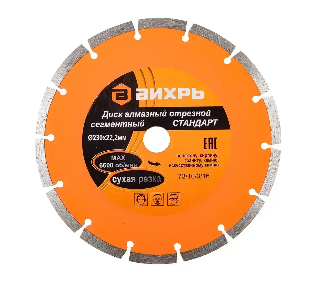 Диск алмазный отрезной сегментный СТАНДАРТ, 230 х 22,2 мм, сухая резка Вихрь