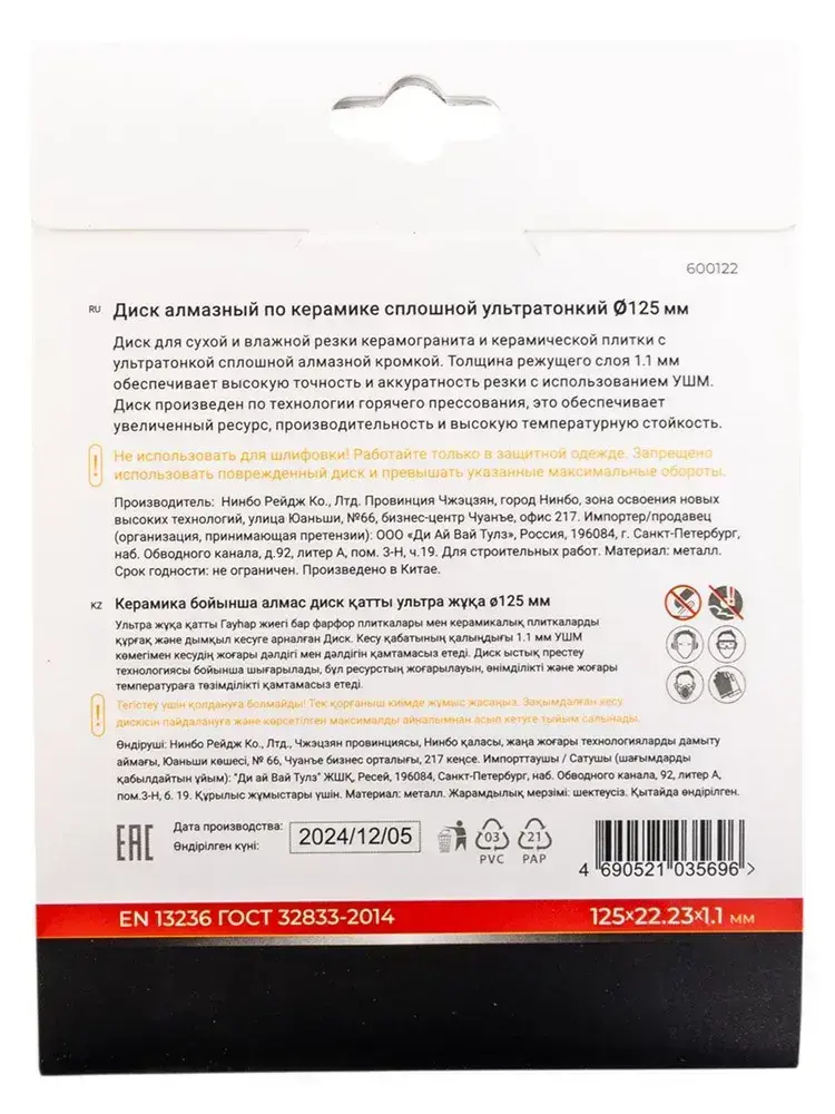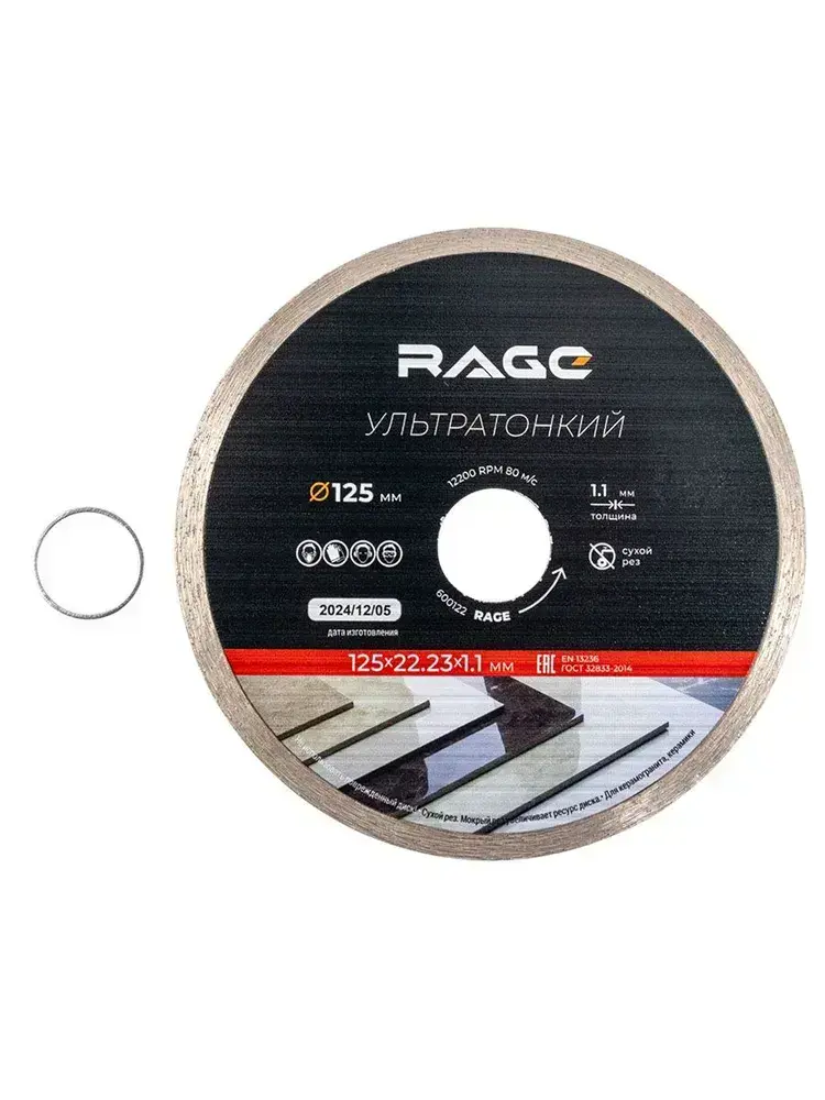 Диск алмазный по керамограниту сплошной ультратонкий 125 мм RAGE