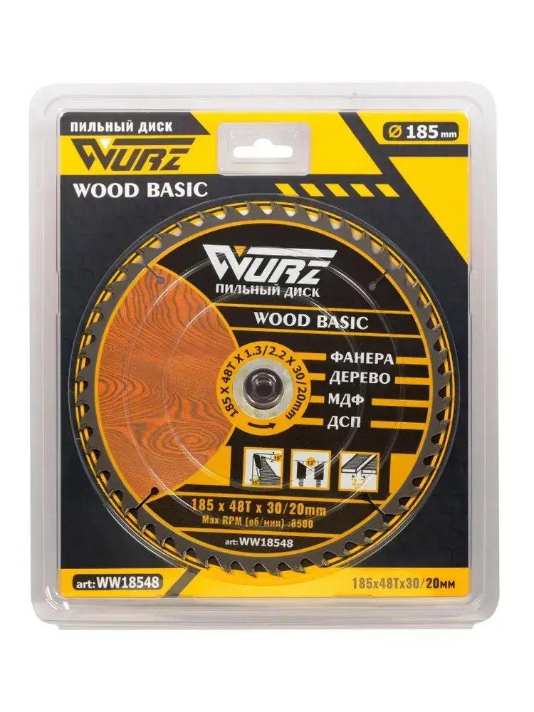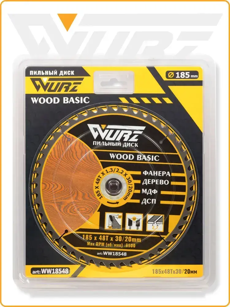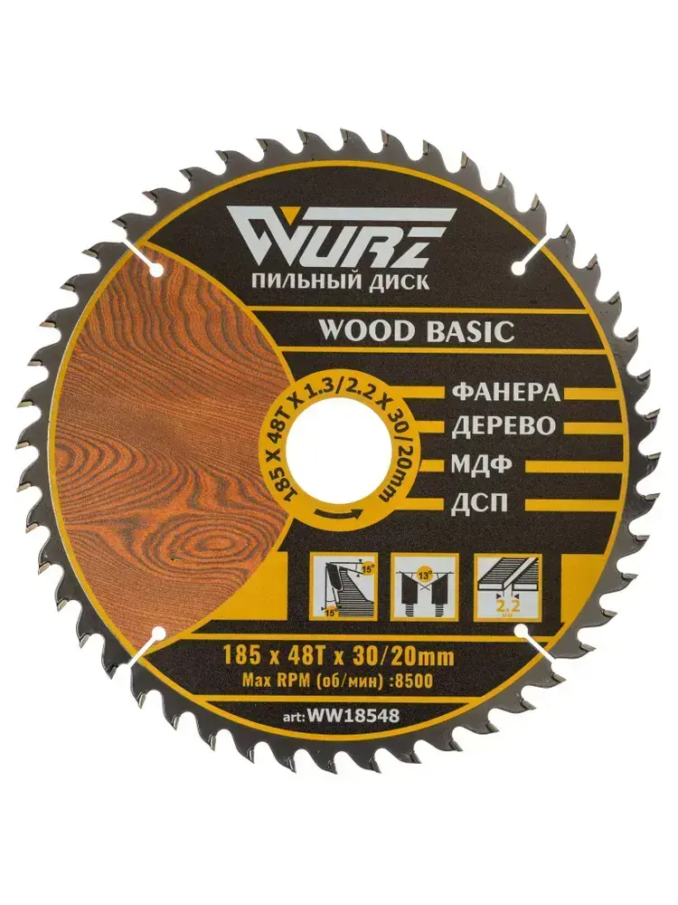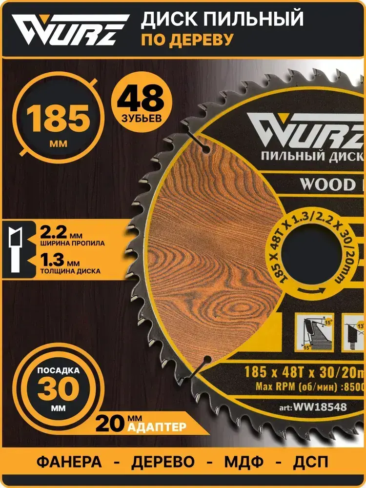Диск пильный по дереву 185х48Тх1.3/2.2х30/20мм WURZ WW18548