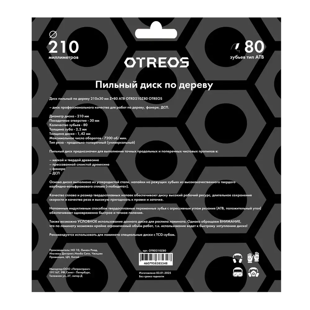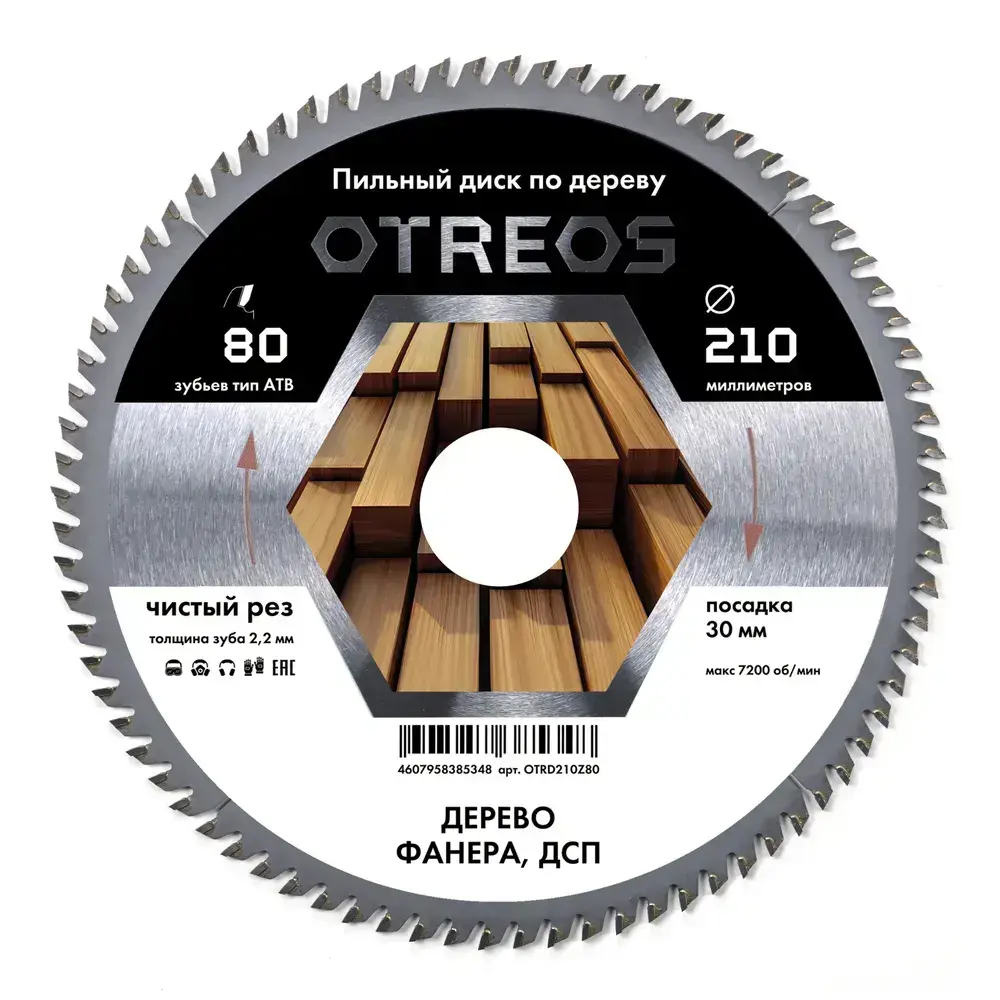 Диск пильный по дереву 210х30 мм 80 зубов АТВ, чистый рез OTREOS