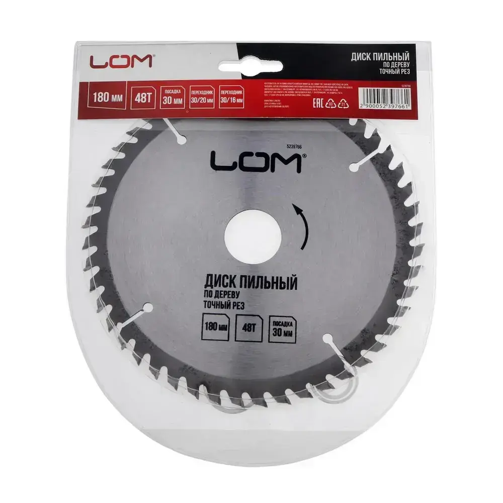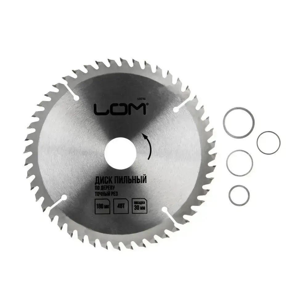 Диск пильный по дереву ЛОМ, точный рез, 180 х 30 мм, 48 зубьев + кольца 20/30, 16/30