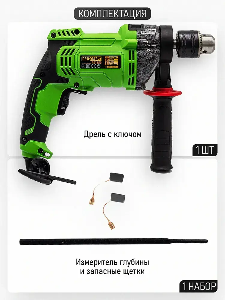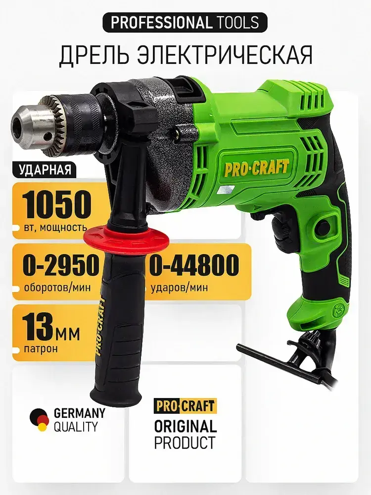 Дрель электрическая ударная PS1350 PROCRAFT 1050 Вт, 0-2950 об/мин, 0-44800 уд/мин
