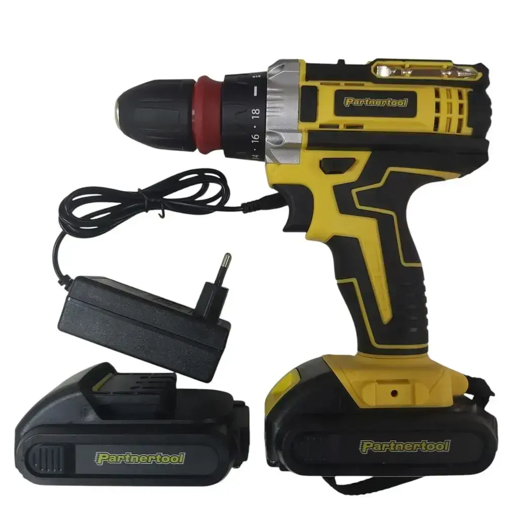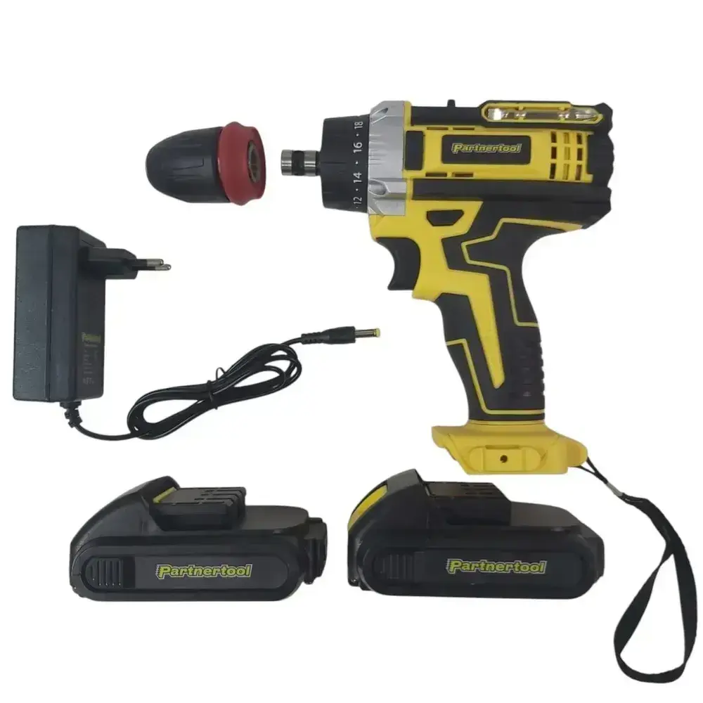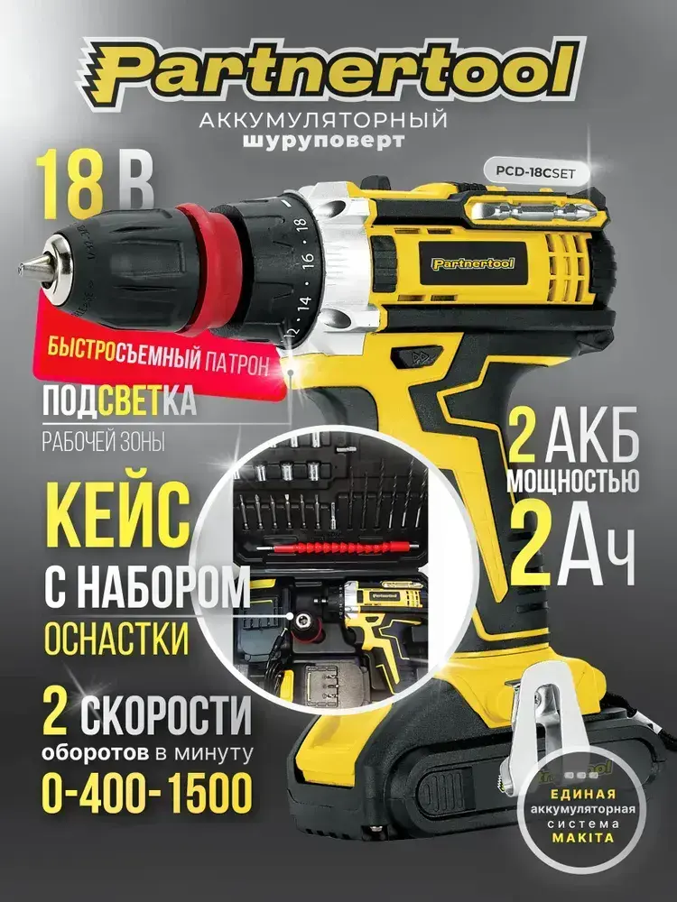 Дрель-Шуроповерт аккумуляторный Partnertool PCD-18CSET 18В 2 аккумулятора 2Ач БЫСТРОСЪЕМНЫЙ патрон в КЕЙСЕ с НАБОРОМ