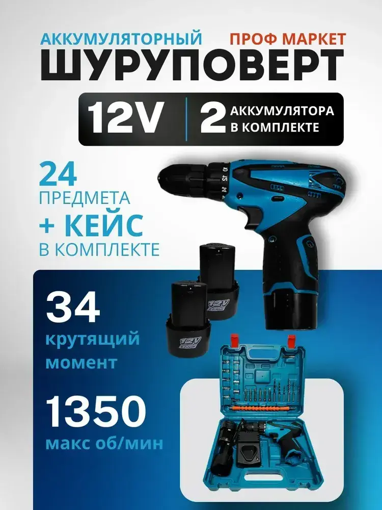 Дрель-шуруповерт, 12 В, 34 Нм, 2 АКБ