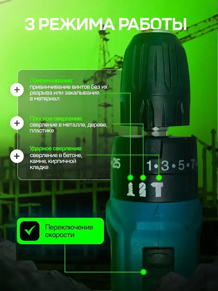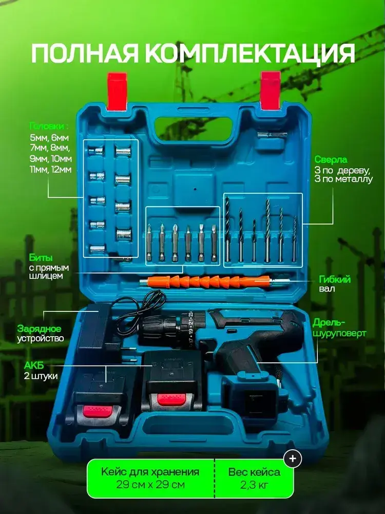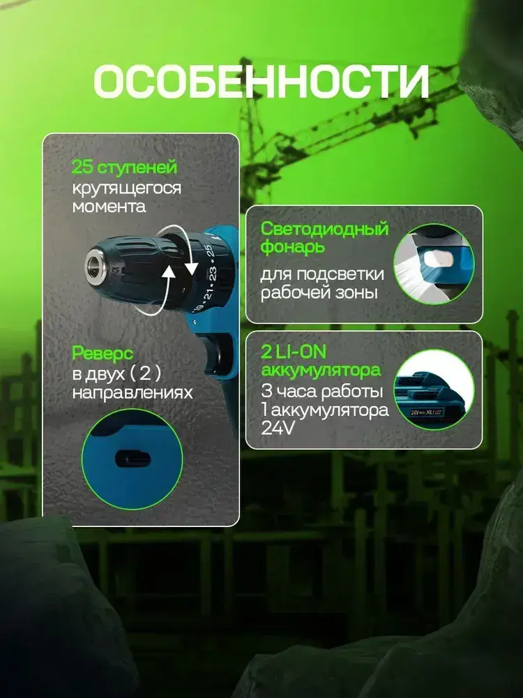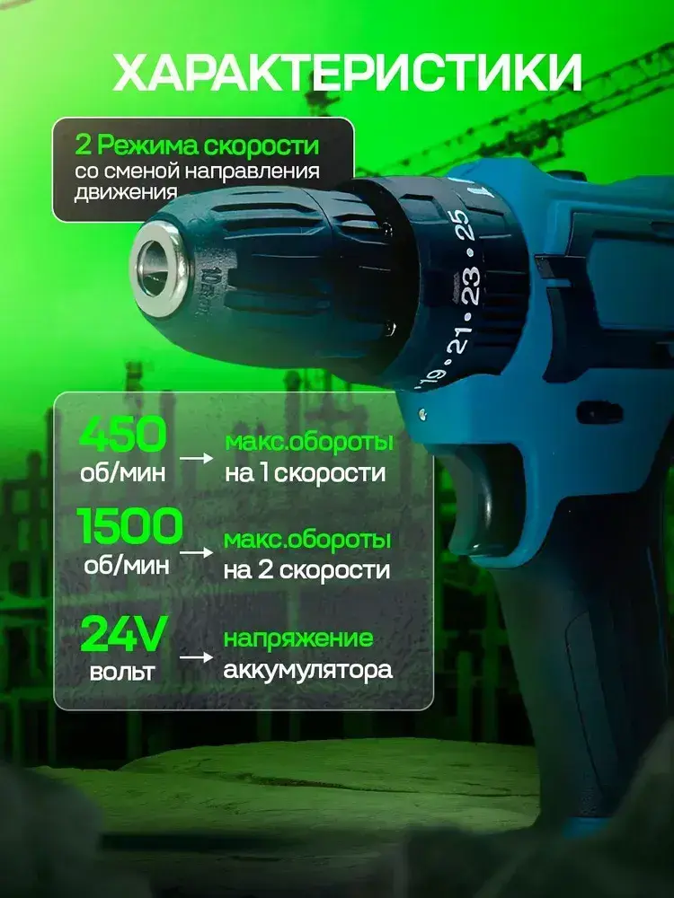 Дрель-шуруповерт, 24 В, 45 Нм, 2 АКБ